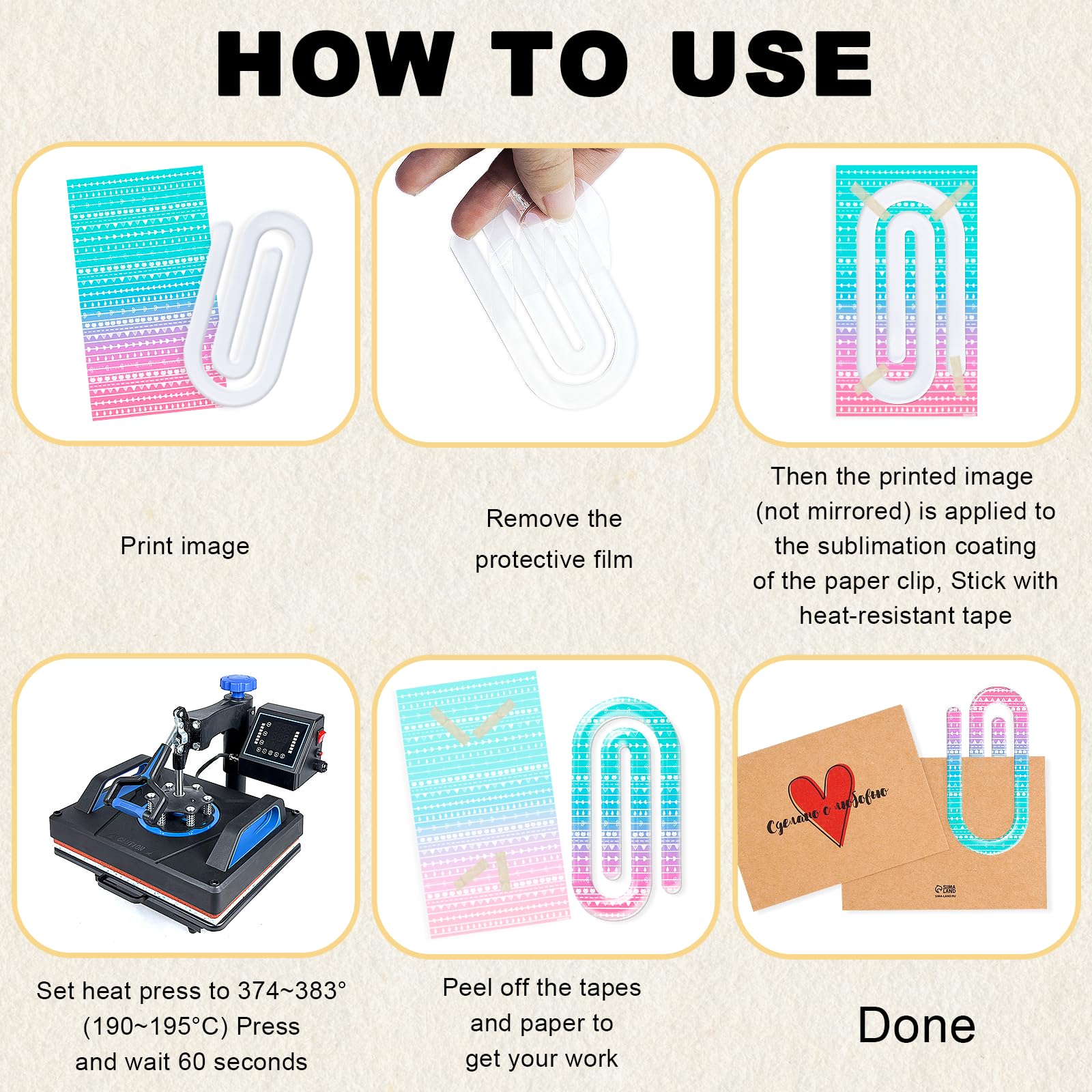 - Sublimation Tips: This large blank sublimation paper clips need to remove the protective film before sublimation (protective film on both sides); The temperature setting is recommended to be 190~195°C, which is about 374~383°F, and the sublimation time is recommended to be 60 seconds, no mirror design required, Note: Only the white coating surface can be sublimated