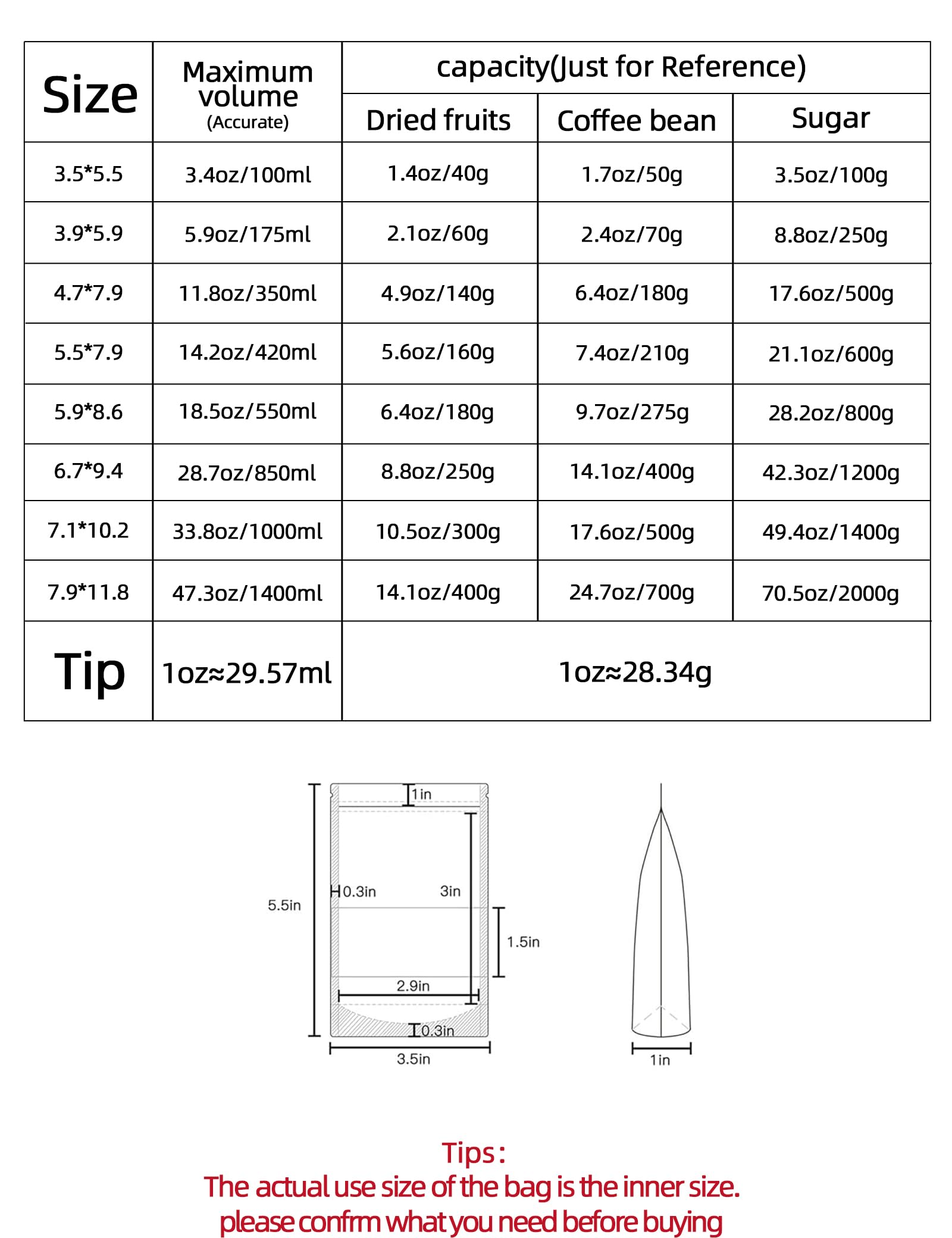 - 【Quantity & Material】Package include 100 pieces kraft stand up pouches. Outer dimension:3.5*5.5 inch,Inner dimension:2.9*3inch; Made from food grade kraft paper and plastic, which is odorless, reusable and moisture proof, keeps your products freshness.Practical bags for packing product.Please note that the size is small, please check the size before ordering.