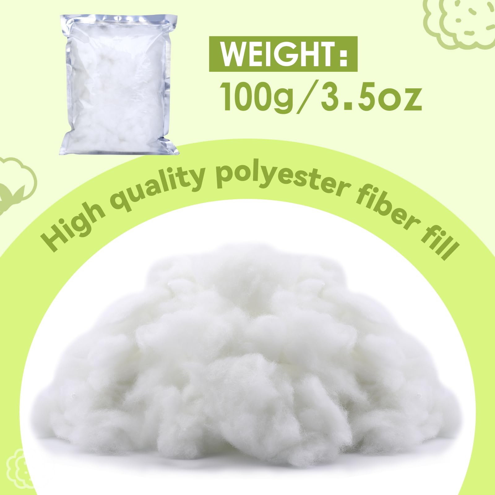 - Soft Polyfill Stuffing: 100g/3.5oz poly filling stuffing, compact and lightweight for all types stuffing of crafts and home decor projects, 100g/3.5oz fiberfill stuffing is suitable for small crafts, please refer to the picture details for the exact volume required