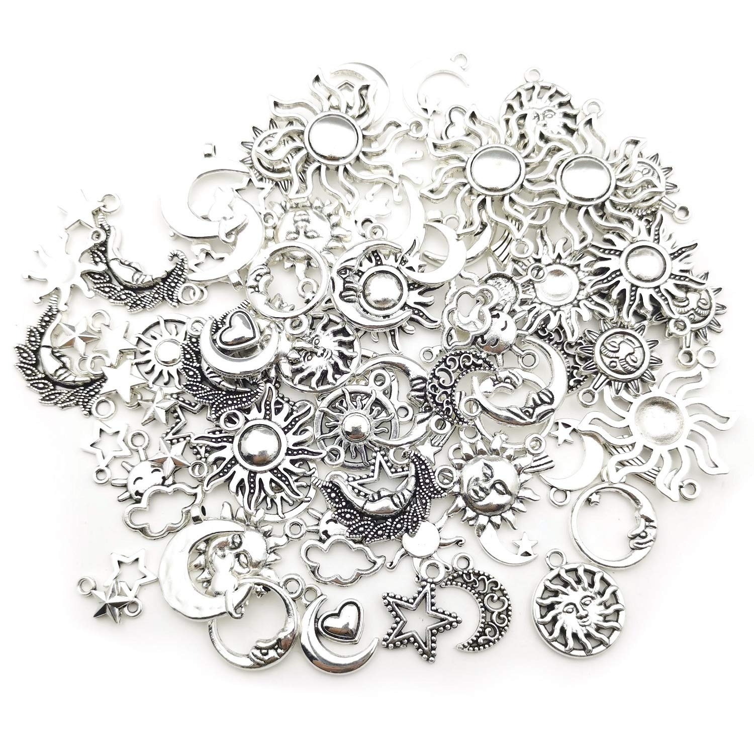 100g(80pcs) Craft Supplies Mixed Antique Silver Sun Moon Stars Charms Pendants for Crafting, Jewelry Findings Making Accessory for DIY Necklace Bracelet (M250)