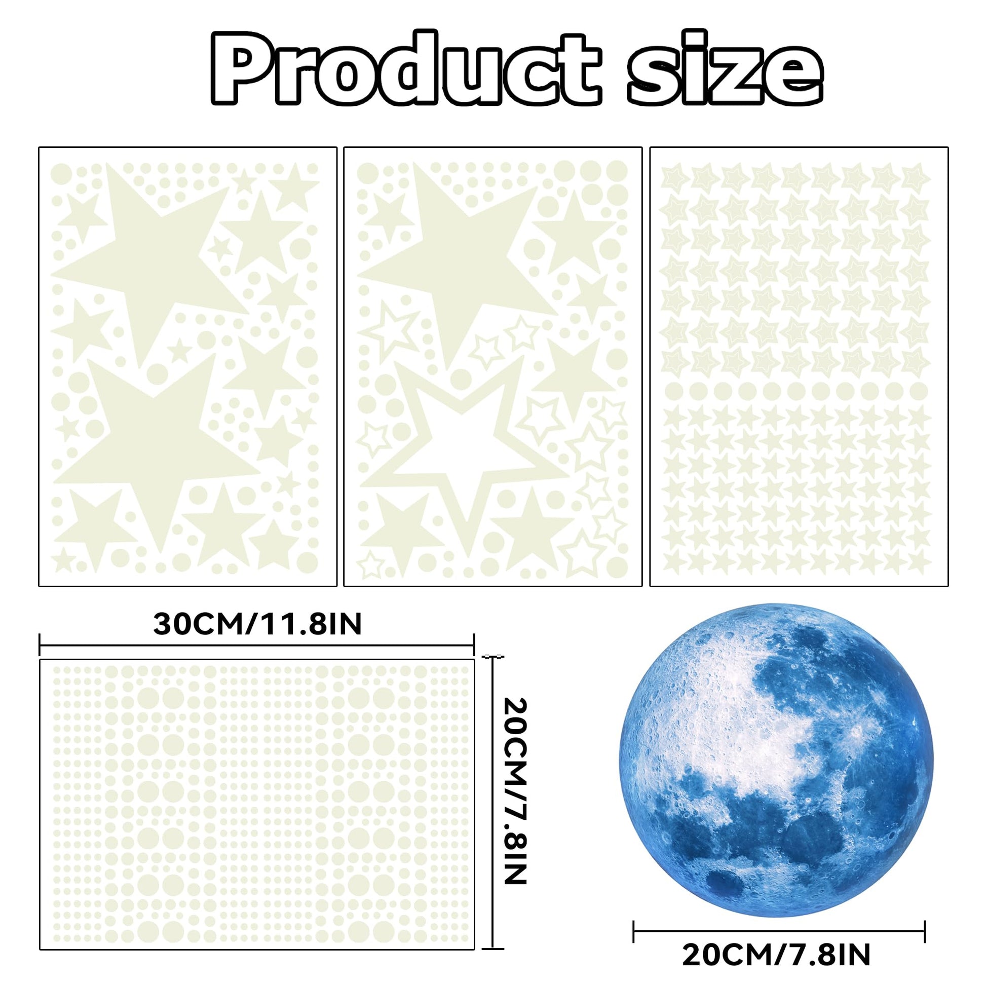 - What You Will Get: You will get glow in the stars and moon combination in one set, Including 1 Pcs sky blue glowing moon and many glowing stars,dots,You could create any shape or styles with own imagination.These adds the look of a real night sky,which make the boring room become to starry shiny bedroom,ideal for nursery and kids bedroom decoration