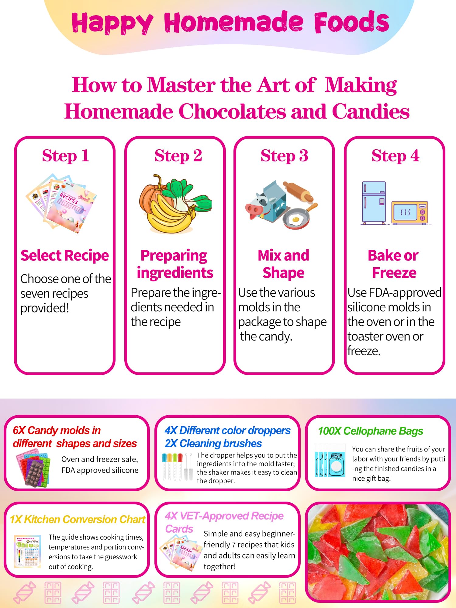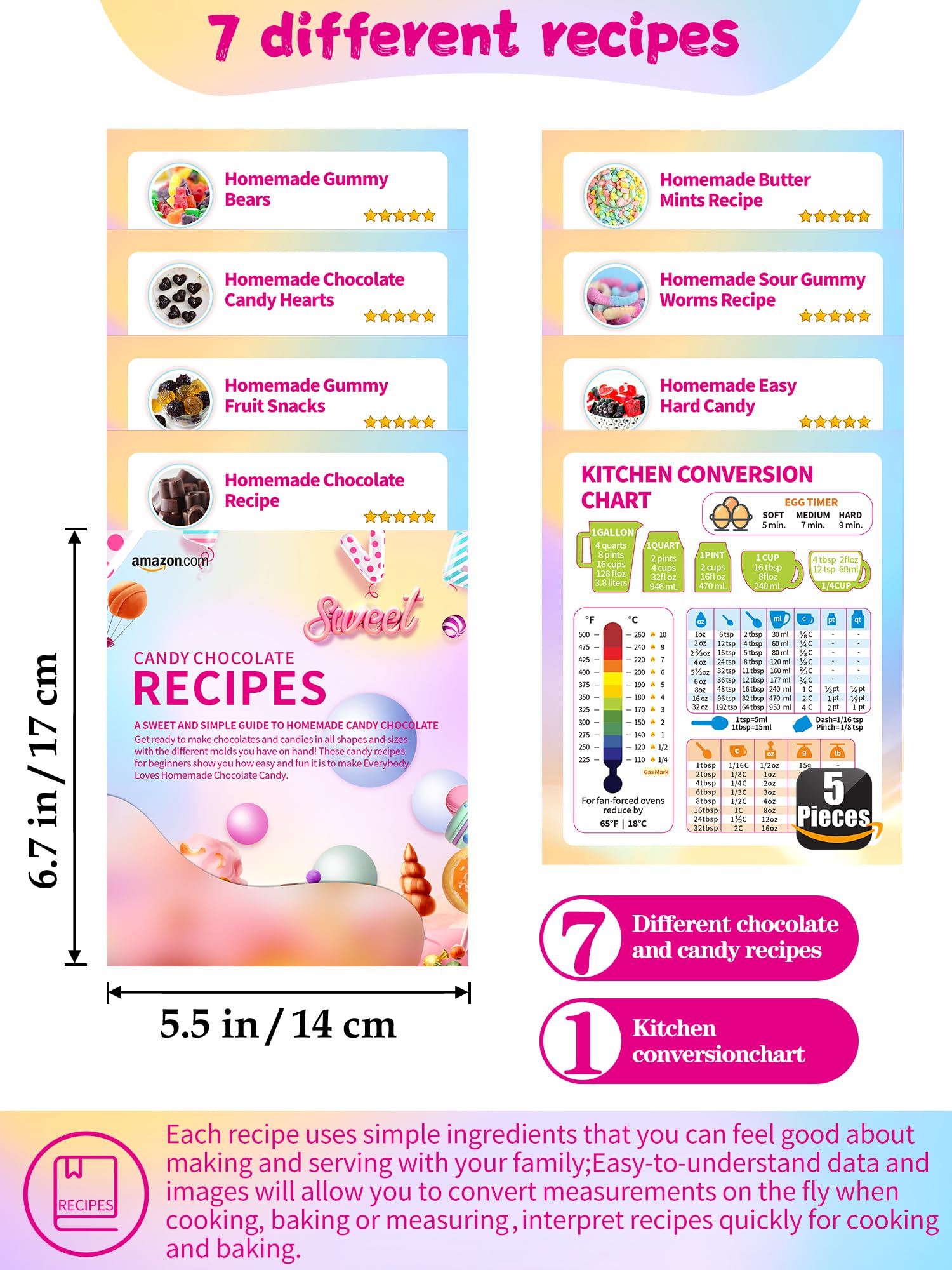 • 📚 "7 Creative Recipe Cards Included – From Gummy Bears to Chocolate Lollipops, Step-by-Step Guides Make Candy-Making Fun and Easy for All Ages!"