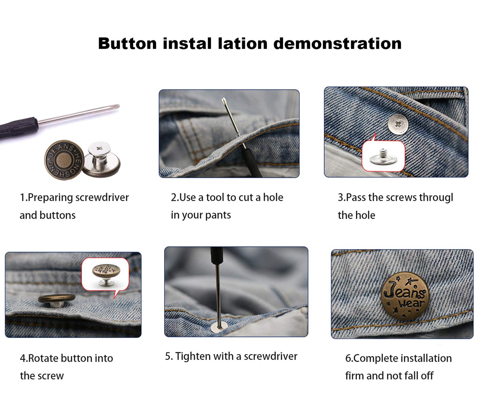 - Nailless threaded rivets,easy to disassemble and reusable.button pin just use the screwdriver to screw or unscrew for quick and easy button installation for your jeans, trousers or jacket.