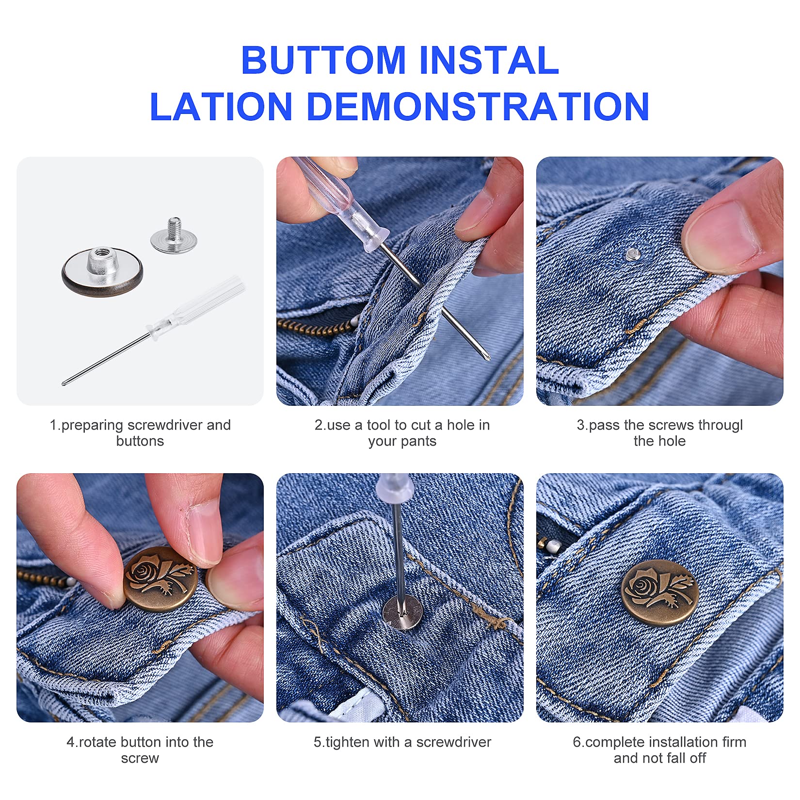 - SUPER STRONG AND DURABLE: Our metal buttons for jeans is made of high-quality zinc alloy, which is durable, rust and corrosion resistant. The no sewing jean button uses threaded connection to install simple and firm, and can be detached and reused.