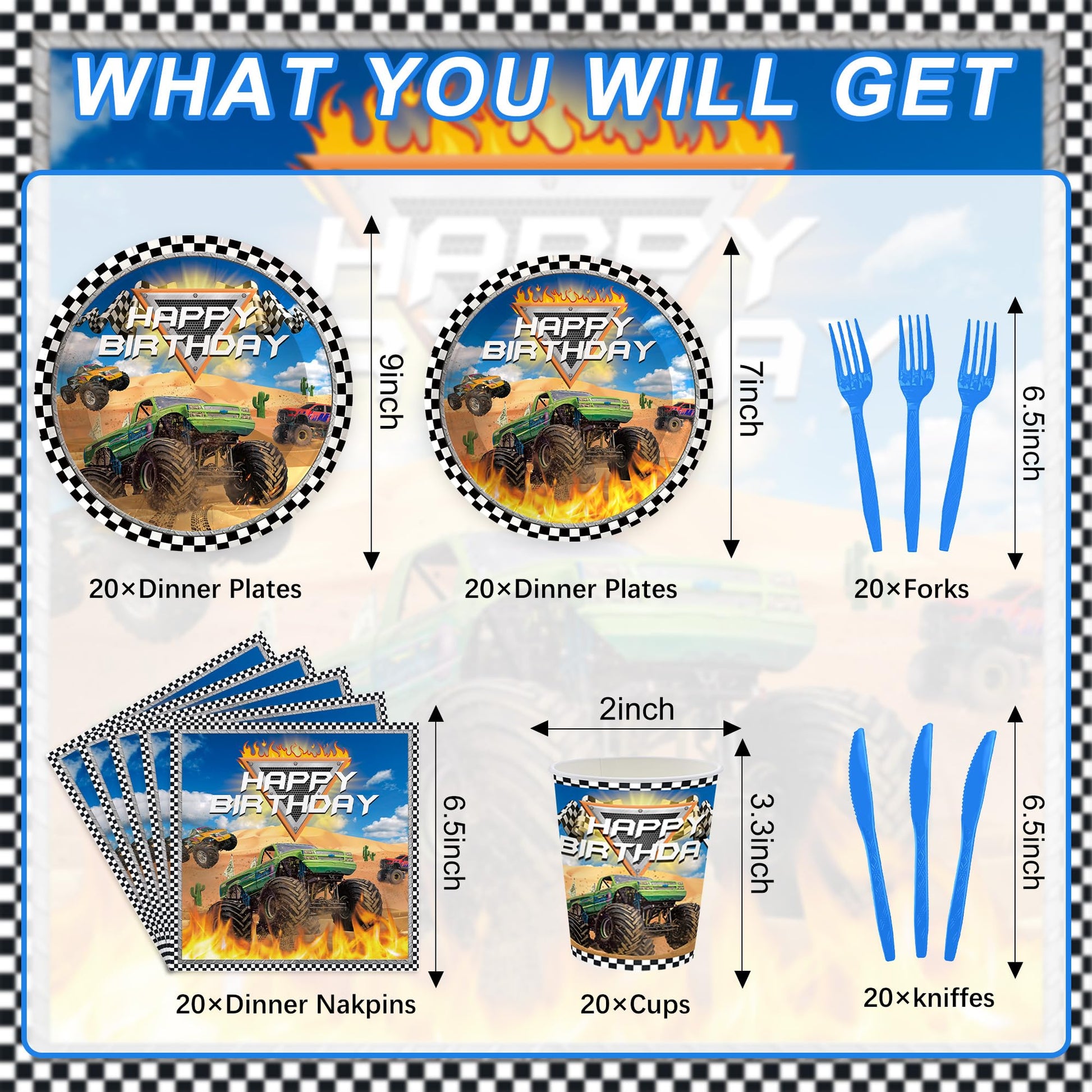 - 【Serves 20 Guests】In Monster Truck themed Party Packs,You will get ① 9inch Plate x20 ,② 7inch Plates x20,③ napkins x 20, ④ cups x 20, ⑤ knives x 20,⑥forks x 20 .Total 120PCS party tableware.