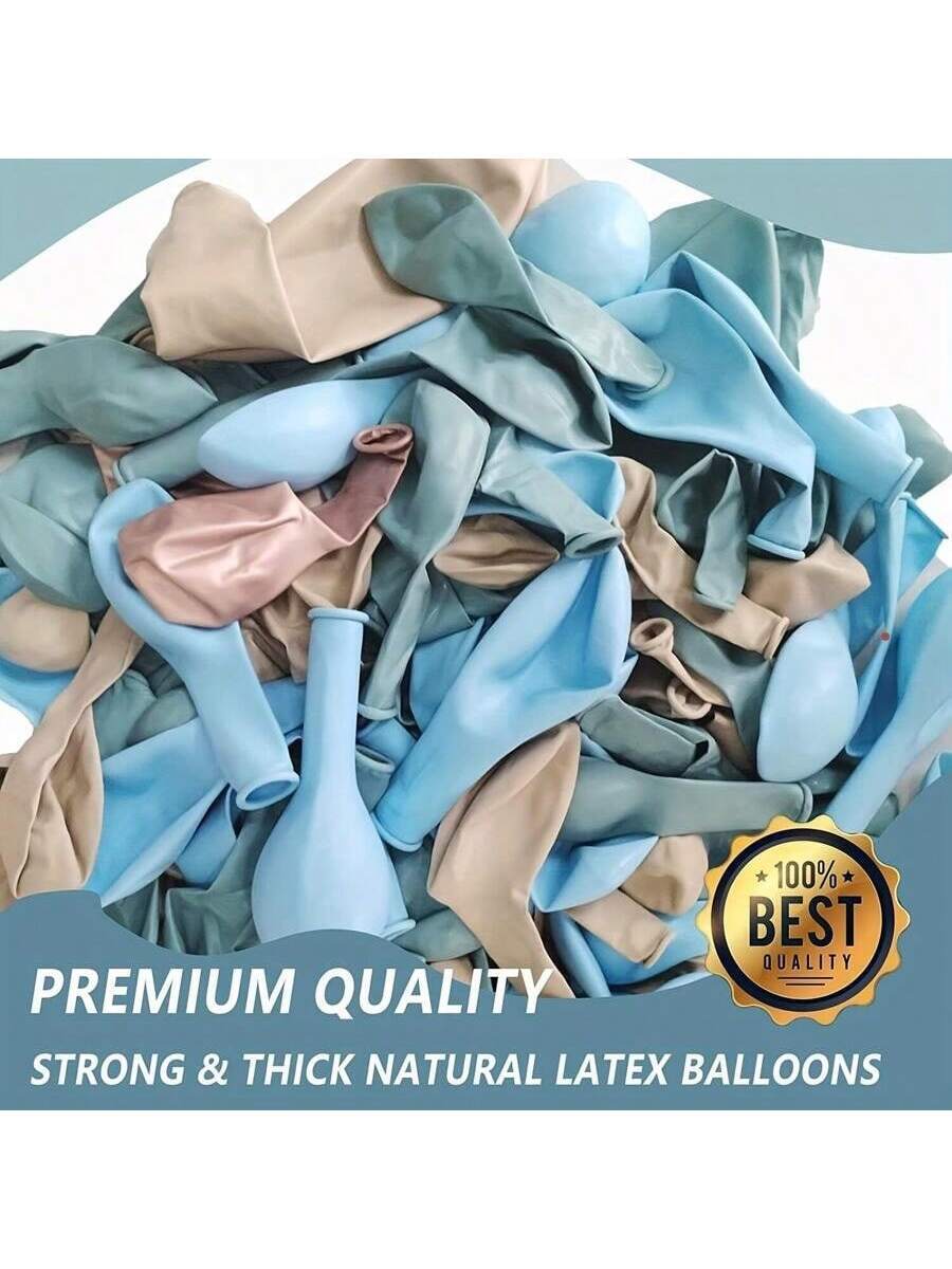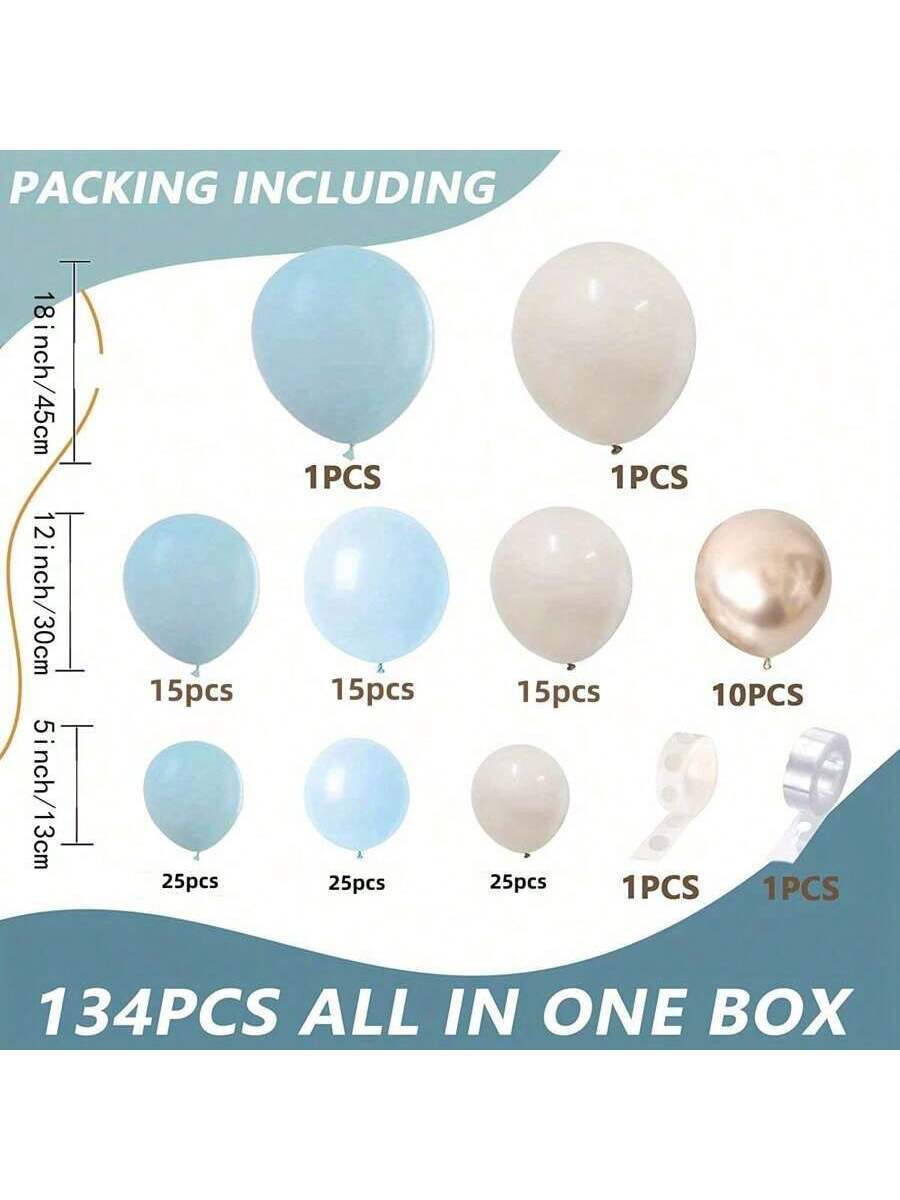 This is a 134-piece balloon set in macaron blue and gold colors. The latex balloons range from 5 to 18 inches in size and are designed for creating arches and garlands for various celebrations.