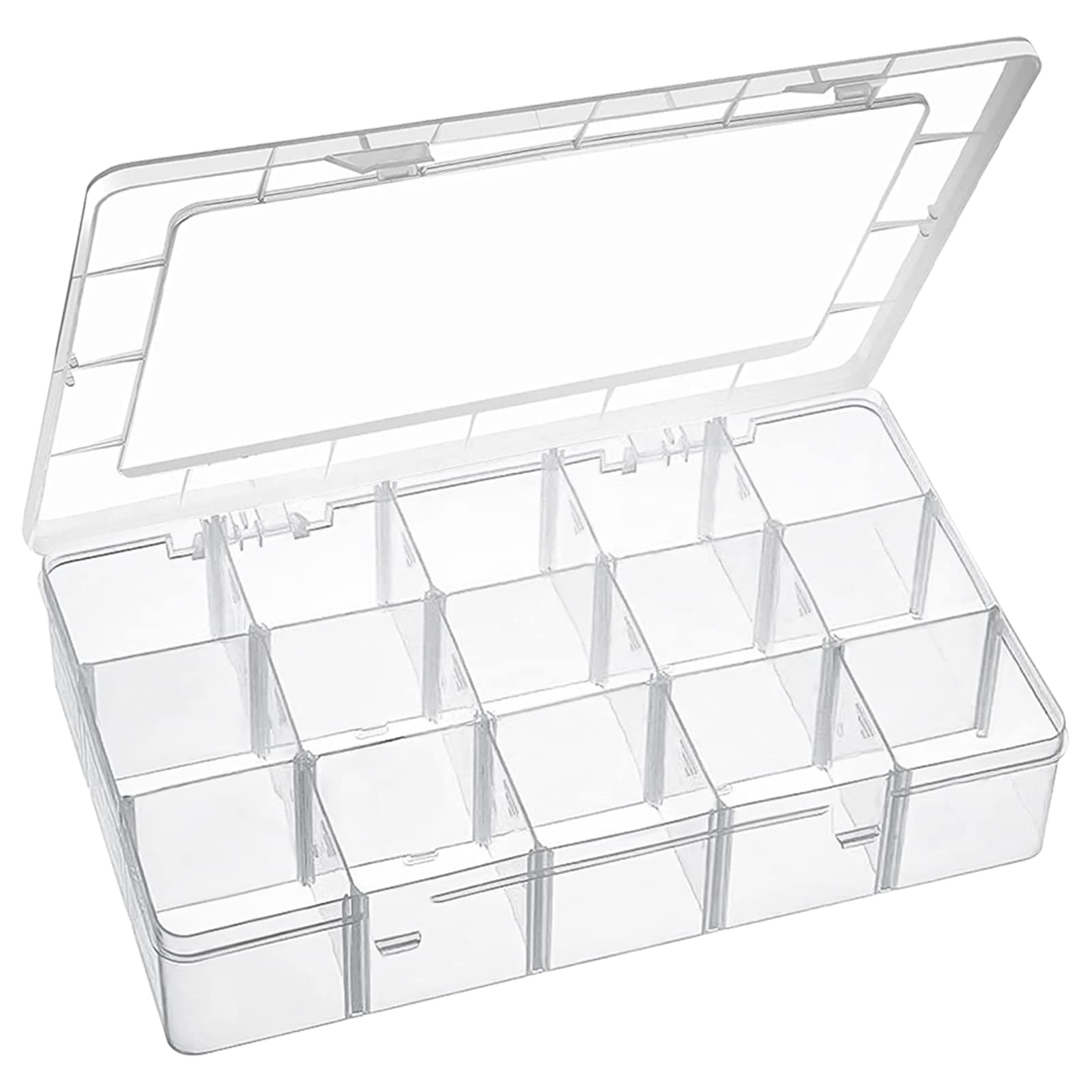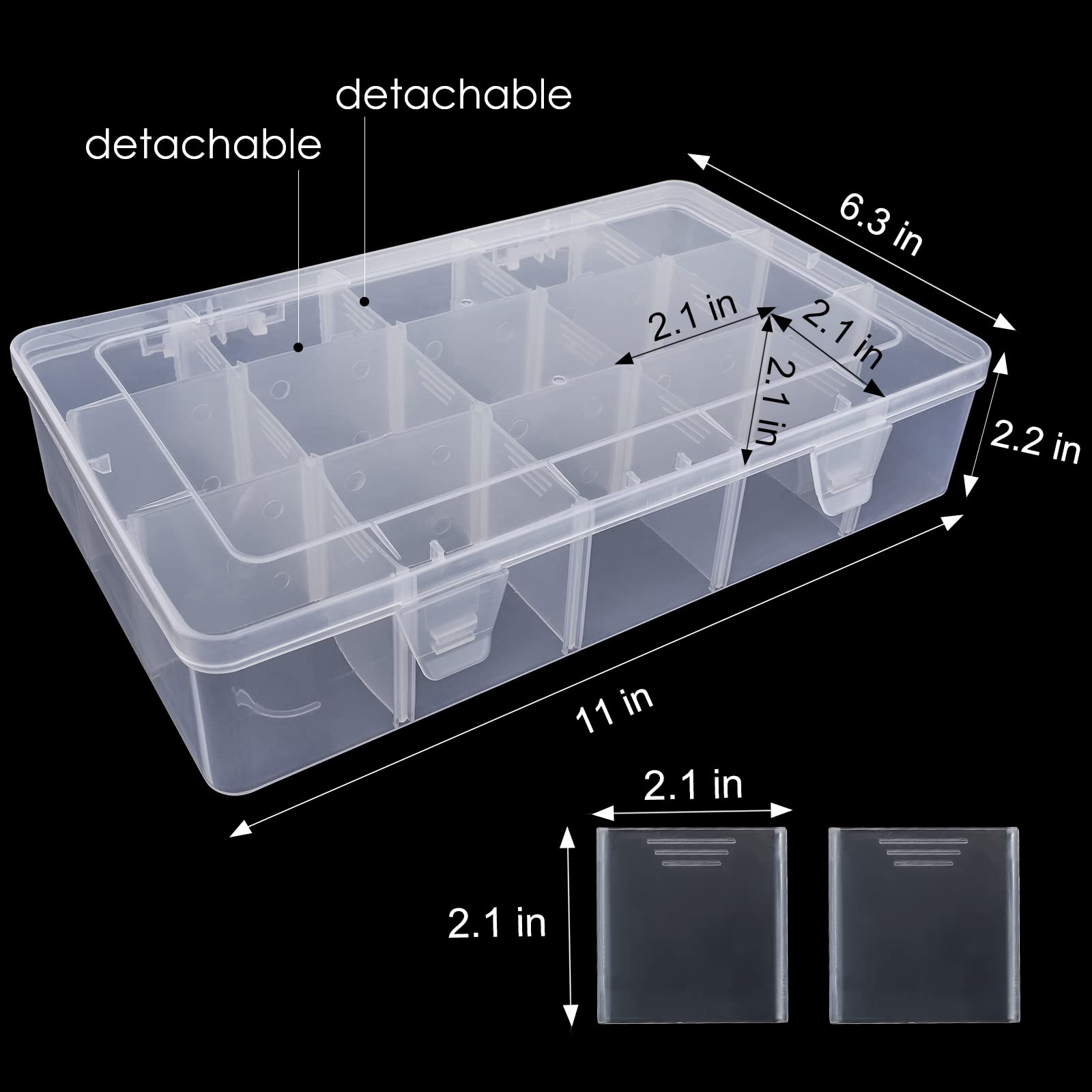 Specifications: Color: Transparent Divider: 14 pcs Compartment: 1-15 grids The outer box size: 11 x 6.3 x 2.2 inches The Grid Size: 2.1 x 2.1 x 2.1 inches