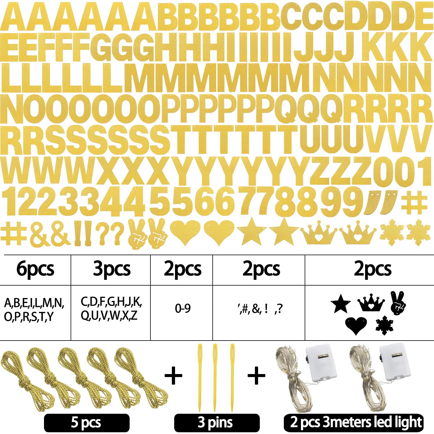 - 【What you can GET】167 pieces of letters and numbers Banner Kit, including 6pcs'A,B,E,I,R,T,L,M,N,O,P,S,Y' letters, 3pcs 'C,D,G,H,U,V,W,F,J,K,Q,X,' letters, 2pcs '0-9' numbers,2pcs' #,',&, !,? ',and 2 ‘stars, crown,snow, hearts,Yeah’ come with 5 ropes ,2 LED light strings and 3pcs Plastic Sewing Needles ; Nice combination meet your various parties decorative demands,exquisite decorations can make your party more attractive!