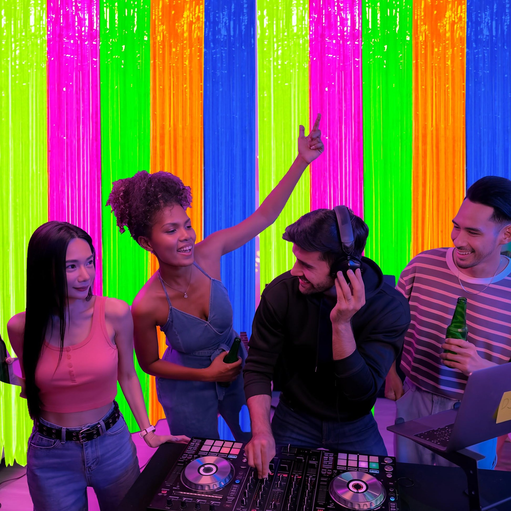 - High-Quality Metallic Foil: Made from durable 0.3mm thick metallic foil, these neon foil fringe curtains are lightweight yet tear-resistant. The reflective surface catches and refracts light beautifully, adding sparkling depth to any neon-themed party or celebration.
