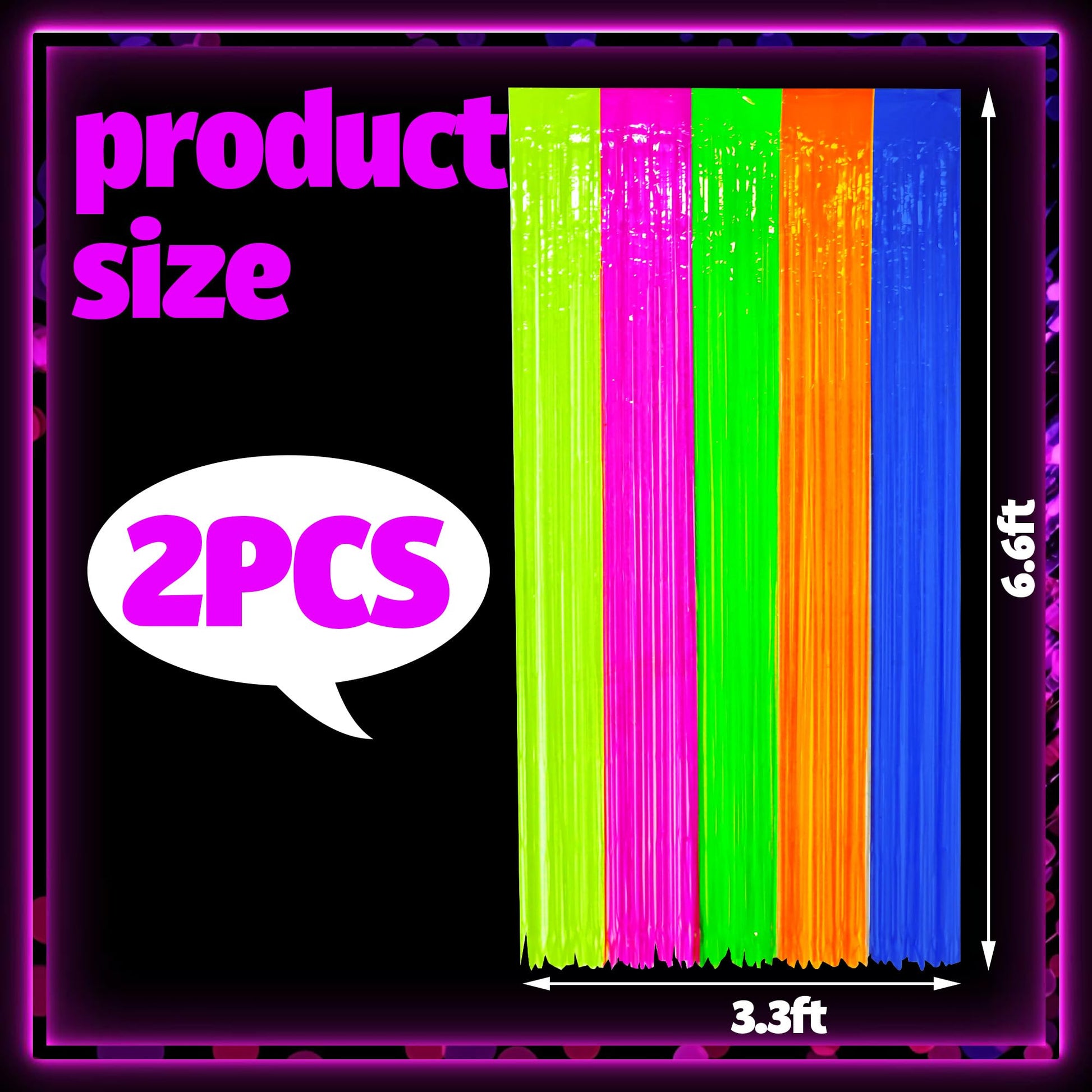 2 Pack Neon Foil Fringe Curtains Glow in The Dark Tinsel Streamers Fluorescent Macaron Foil Fringe Backdrop Neon Party Photo Booth Prop for Glow Birthday Wedding Blacklight Party Decor, 3.3 x 6.6 Ft