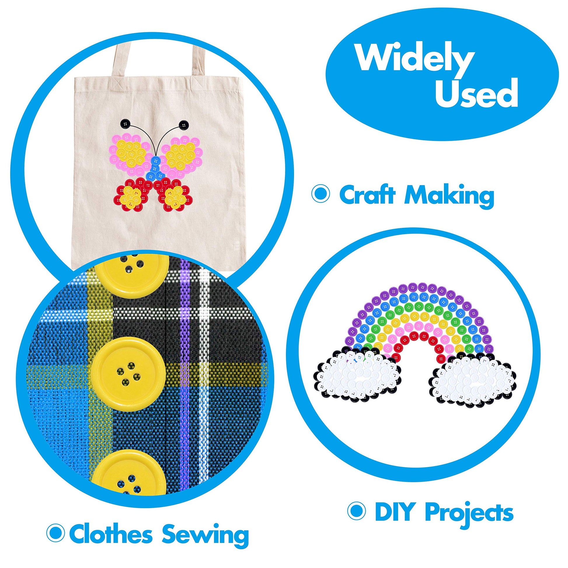 - Easy to Use: Classic round shaped buttons, no harmful corner. Easy maneuver even for little one’s fingers. With the 4 holes you can sewing it tightly to soft materials. With the flatback you can also stick it to flat surfaces with some glue or tape.