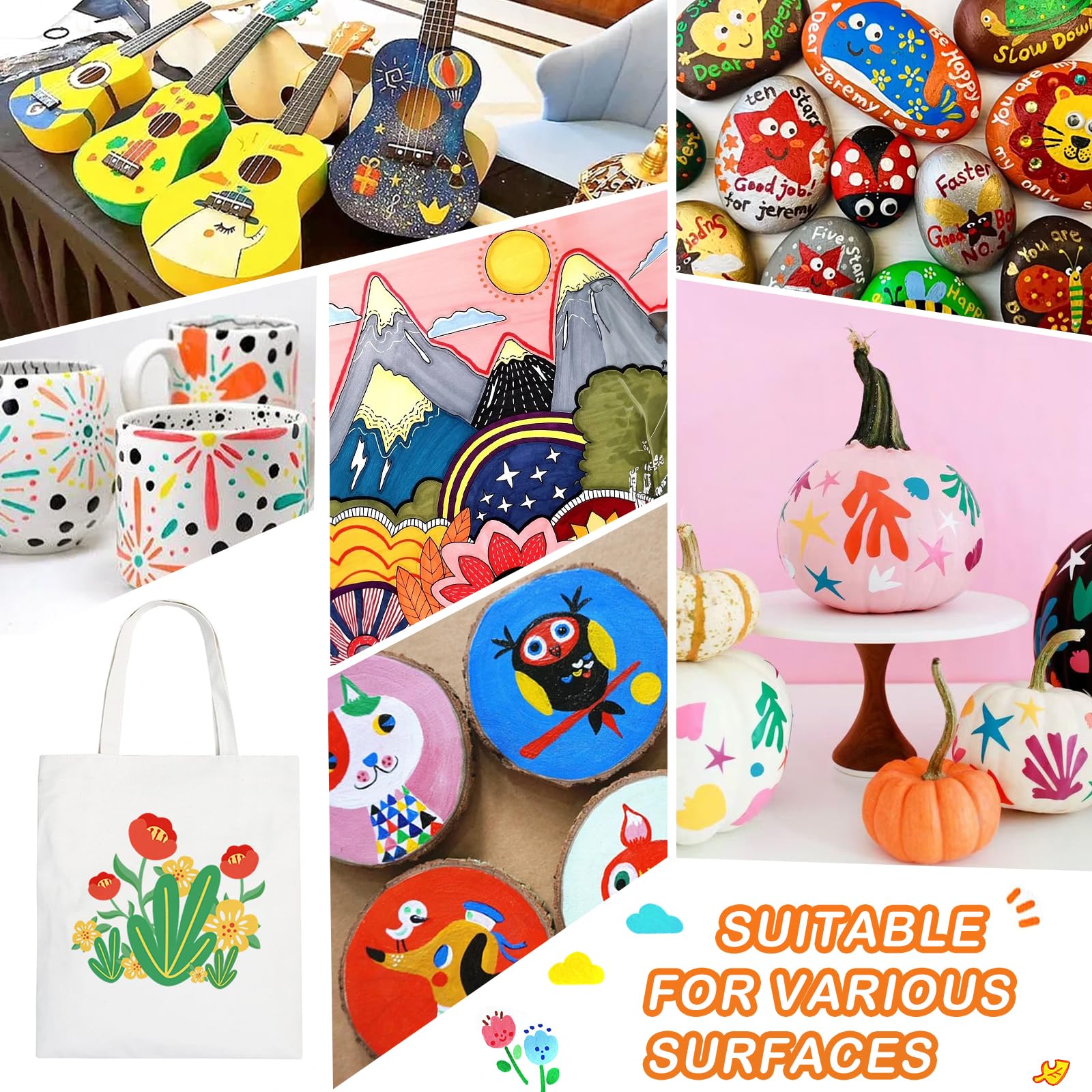 - WIDELY USED: Our 48-color acrylic dual tip markers works on almost all surfaces, you are no longer limited to paper but can work on rock painting, mugs, canvas, fabric, ceramic, tiles, glass, wood, leather, resin, tires, blackboard, Christmas ornament, jars labels, add decoration to graffiti markers, card making, pumpkin kits, easter eggs, and much more for both smooth and porous surfaces. Ideal for kids, students, teenagers, adult, even artists. The wide use brings more convenience to your art design.