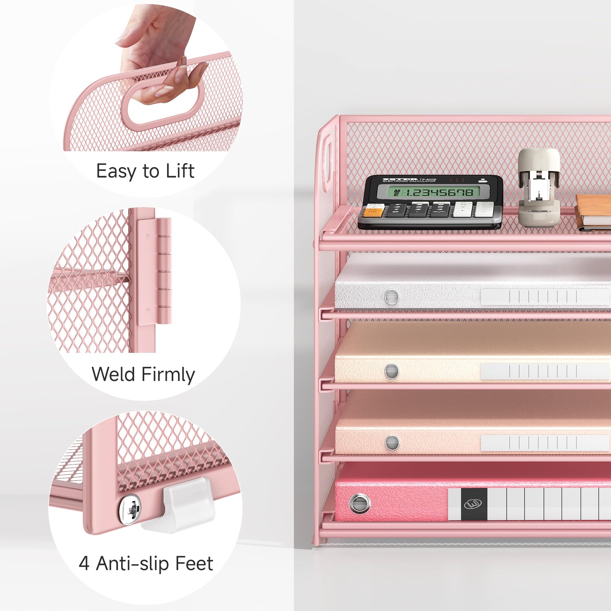 5 Tray Paper Organizer Letter Tray with Handle - Mesh Desk File Organizer, Paper Sorter Organizer for Office, Home or School File Folder Holder - Pink