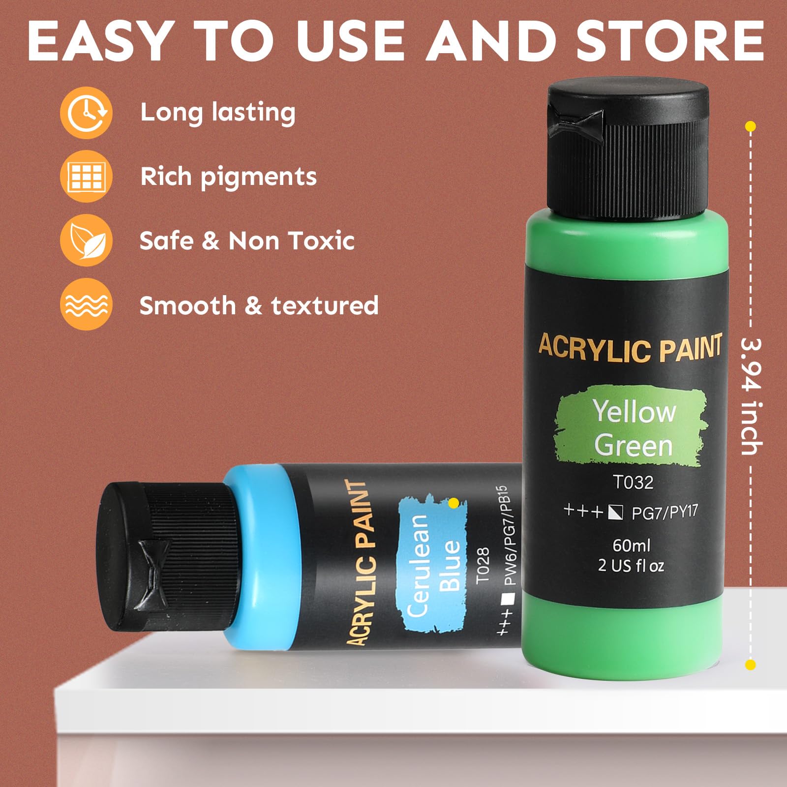 - 24 COLORS PAINT SET WITH 12 BRUSHES -- Our acrylic paint set comes with 48 colors acrylic paint in 60ml/2oz bottles, providing classic colors and inspiring hot fluorescent and metallic colors to your art projects.Easy to use for artists of any age - acrylic paint for professional artists, beginners and students alike.