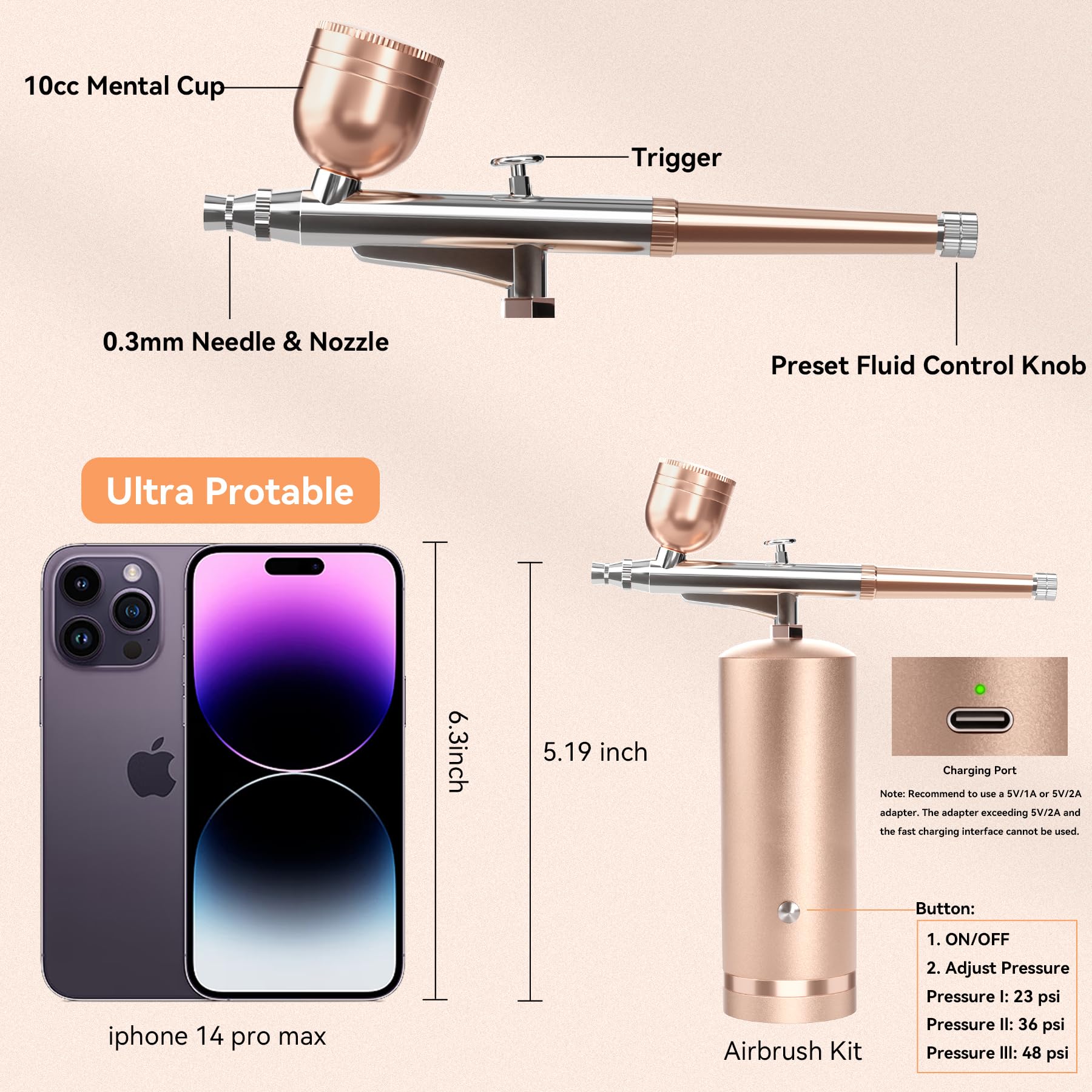 Airbrush Kit with Compressor - 48PSI Rechargeable Cordless Non-Clogging High-Pressure Air Brush Set with 0.3mm Nozzle and Cleaning Brush Set for Nail Art, Makeup, Painting, Cake Decor