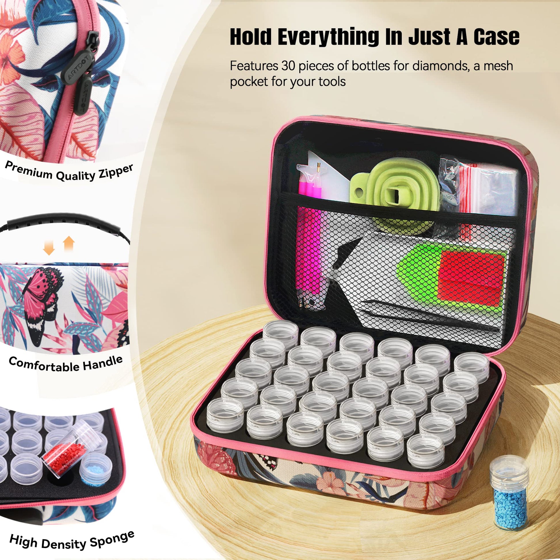 - HOLD EVERYTHING IN JUST A CASE - 30 containers nestled securely in a foam base for excellent anti-collision protection. The spacious net pocket hold all your diamond painting accessories, ensuring everything is tidy. Farewell to the cluttered workspace