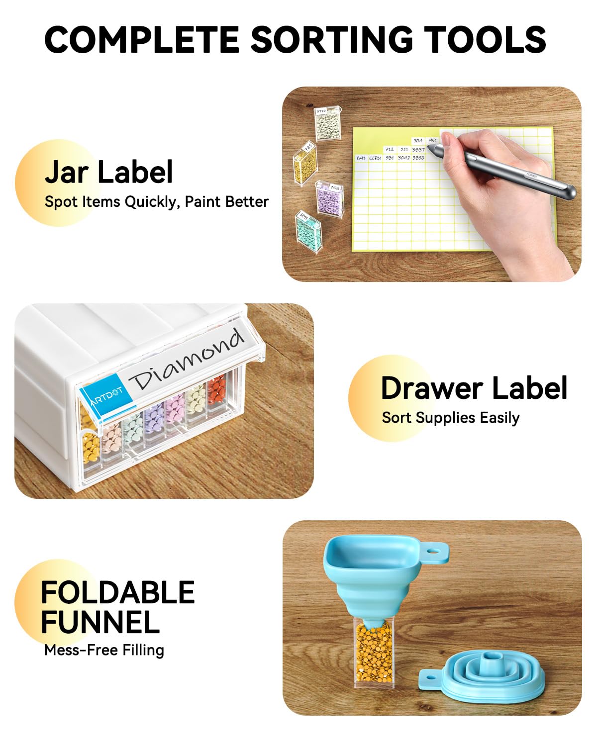 - PRACTICAL TOOL - Includes extra blank labels and stickers for organizing different types and colours of diamond beads, enhancing diamond painting efficiency. The collapsible funnel makes filling bead containers easier and safer, preventing spills
