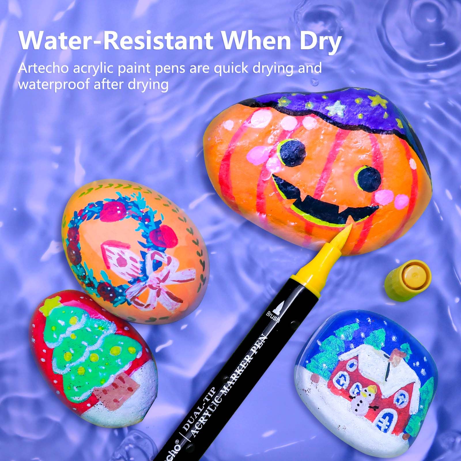 - Features: Artecho acrylic paint pens are are made with water-based ink. They are quick drying, waterproof after drying, strong coverage, long-lasting
