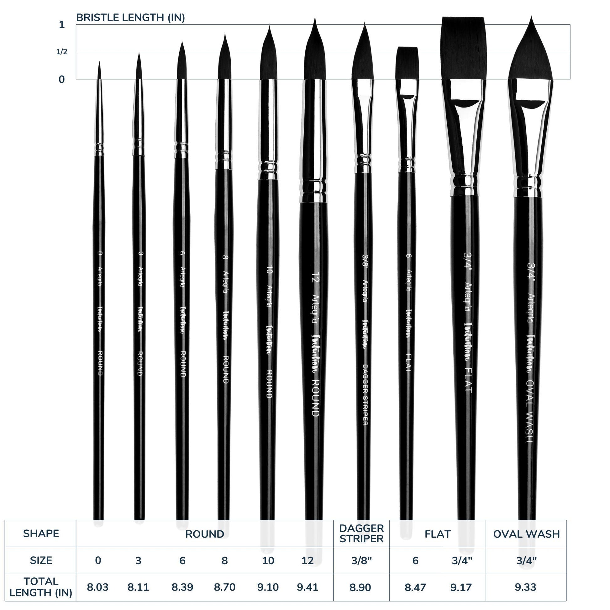 - Designed For Water-Based Paints - Wide variety of shapes and sizes for various watercolor art techniques from precise detail to large washes; Fine tipped Rounds #0 #3 #6 #8 #10 #12; Dagger Striper 3/8"; Oval Wash (Cat's Tongue) 3/4"; Flats #6 3/4"