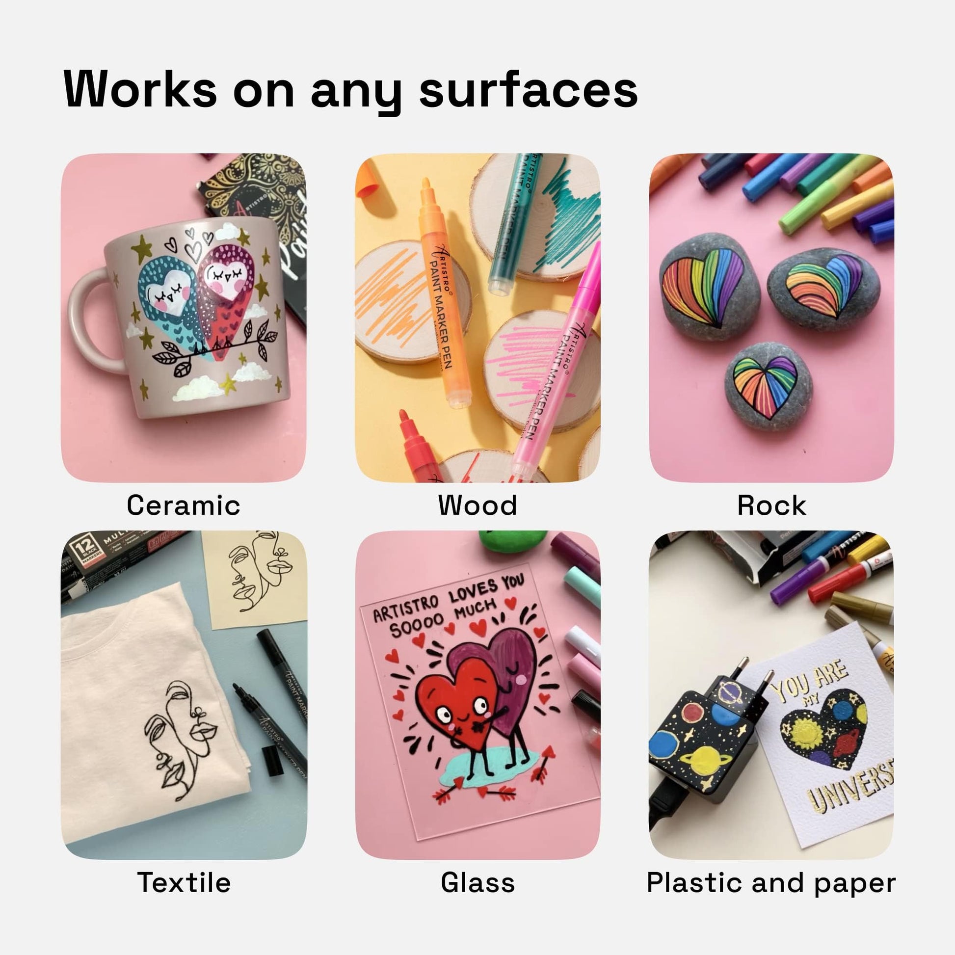 - Safe, Non-Toxic & Odor-Free, Artistro Acrylic markers paint pens pass all USA and EU safety requirements. Create art projects on almost any surface with acrylic paint pens for rock painting, stone, ceramic, glass, wood, fabric, canvas, mug, plastic, textiles, metal and more.