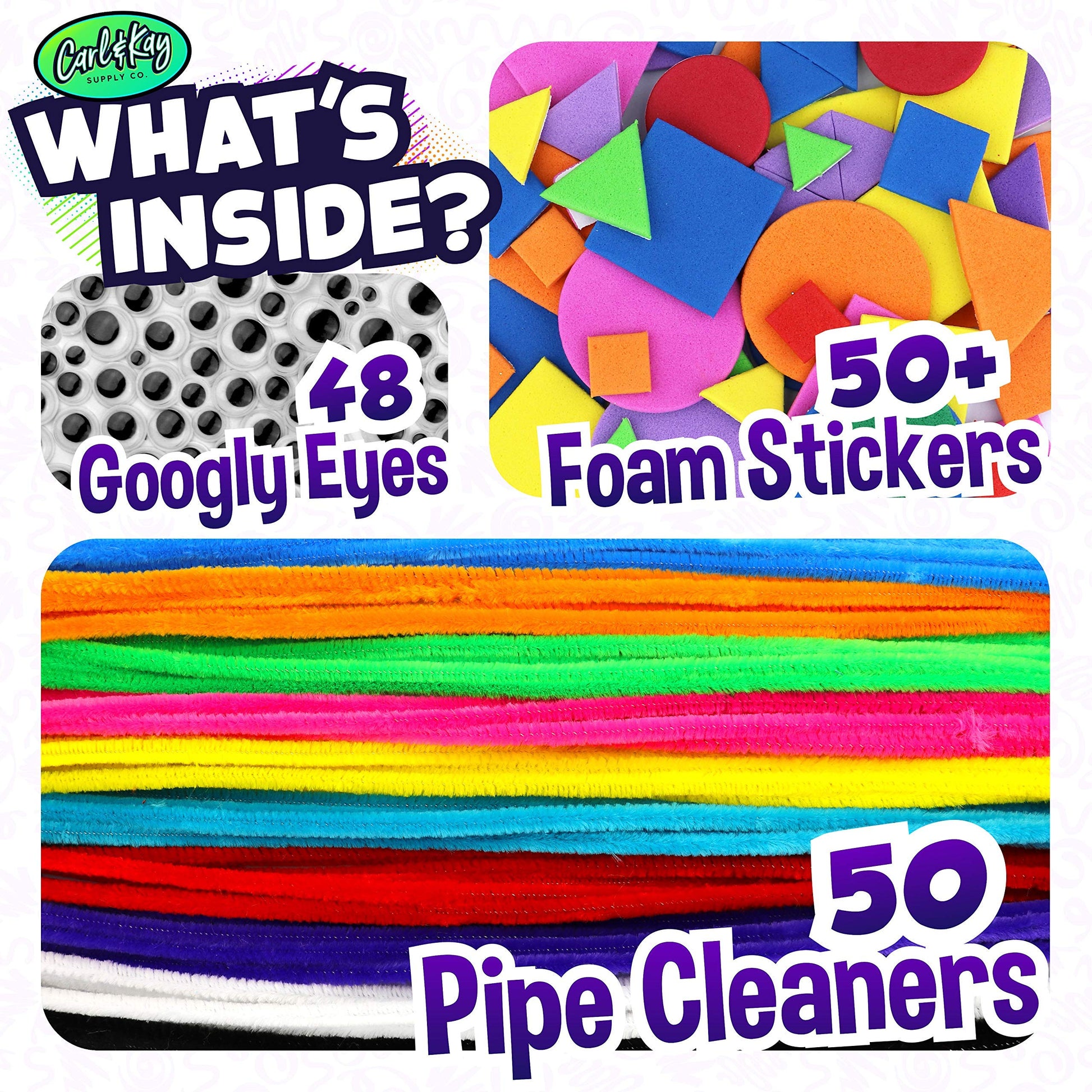 - Includes pipe cleaners, pom poms, googly eyes, foam stickers, feathers, popsicle sticks, sequins and more