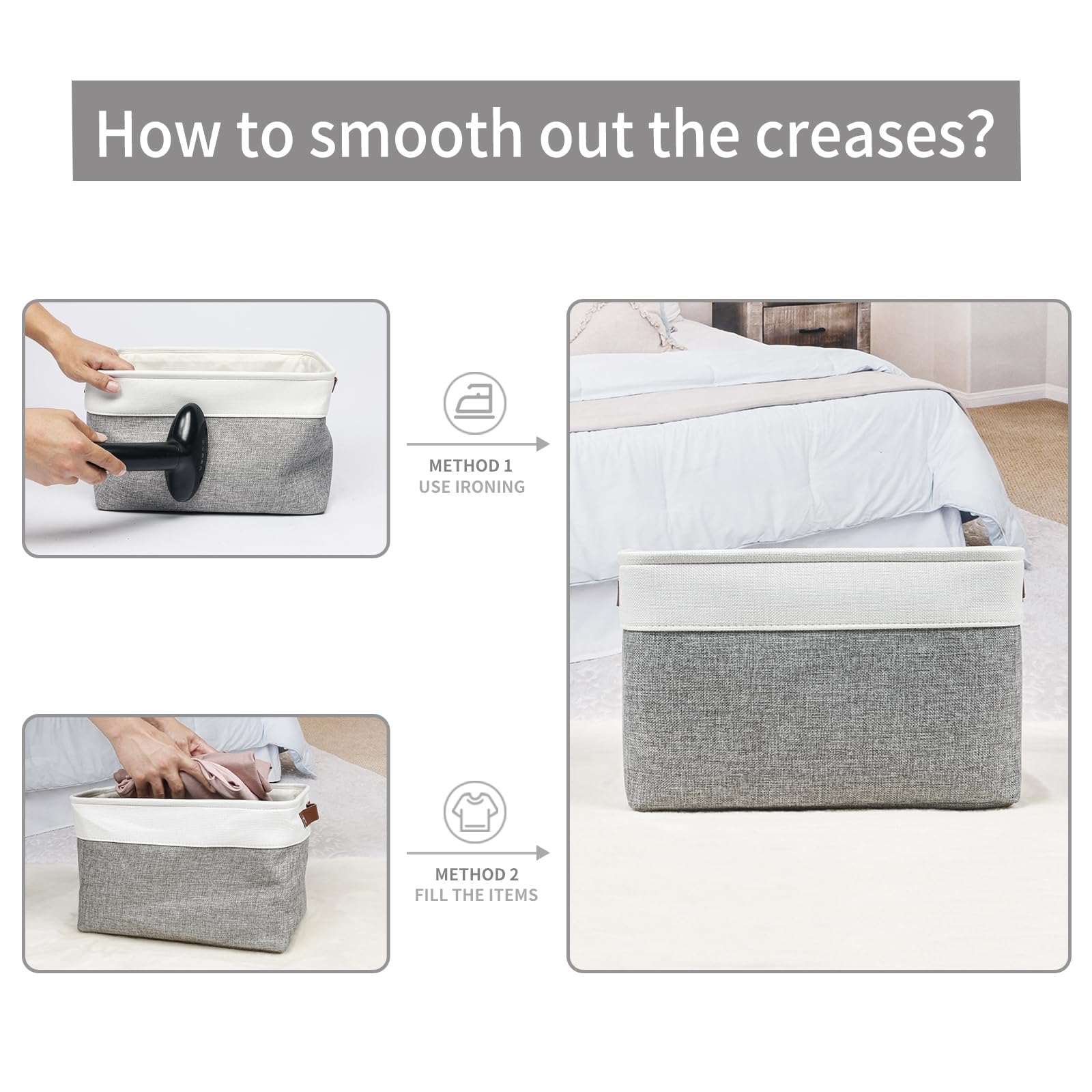 - 【Maintenance & Care Tip】 - Collapsible design for space saving. Our foldable baskets comes in a compression packing which may result in wrinkled storage bin during the long transit. Get rid of the wrinkles by either stuffing the fabric storage bins with blankets and pillows for a few days or steam iron them at low-heat setting. The organization baskets are easy to clean, you can dust the basket with a soft cloth with light soapy water when needed. Not recommended to machine wash.