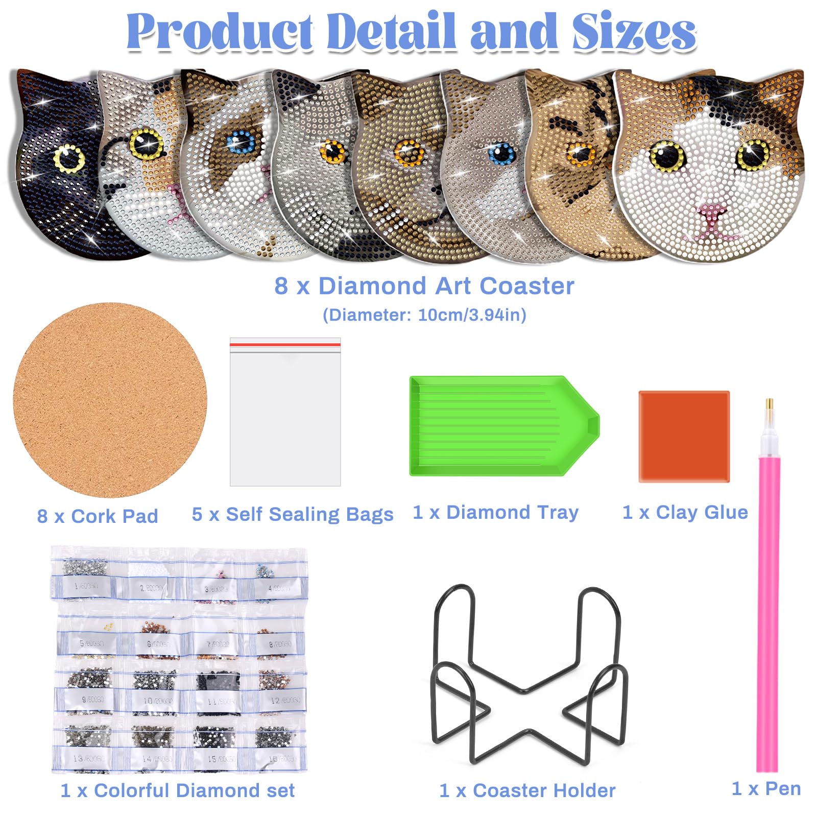 - Package Include: You will get 8 pieces diamond art painting coasters in cute pet cats themed, 8 pieces stickable cork bases, 1 pieces coaster holder, 1 pieces colorful diamonds set, 1 pieces clay glue, 1 pieces diamond art pen, 1 pieces diamond tray, contains all the accessories and tools you need for DIY diamond art coasters