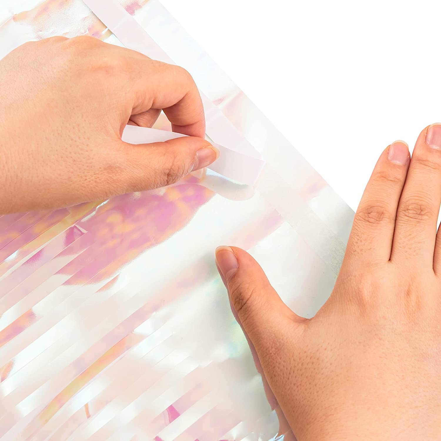 - The top of all fringe streamer curtains is covered with double-sided adhesive tape, No Push Pins or Tack Needed. With a sticky tape on top so they are super easy to hang and stay up pretty well. Perfectly stay in place for the duration of indoor or outdoor event.