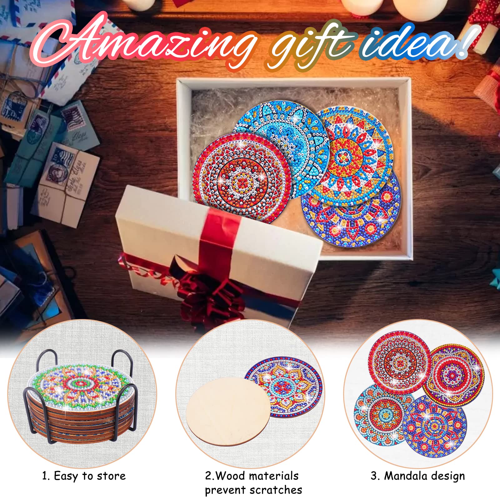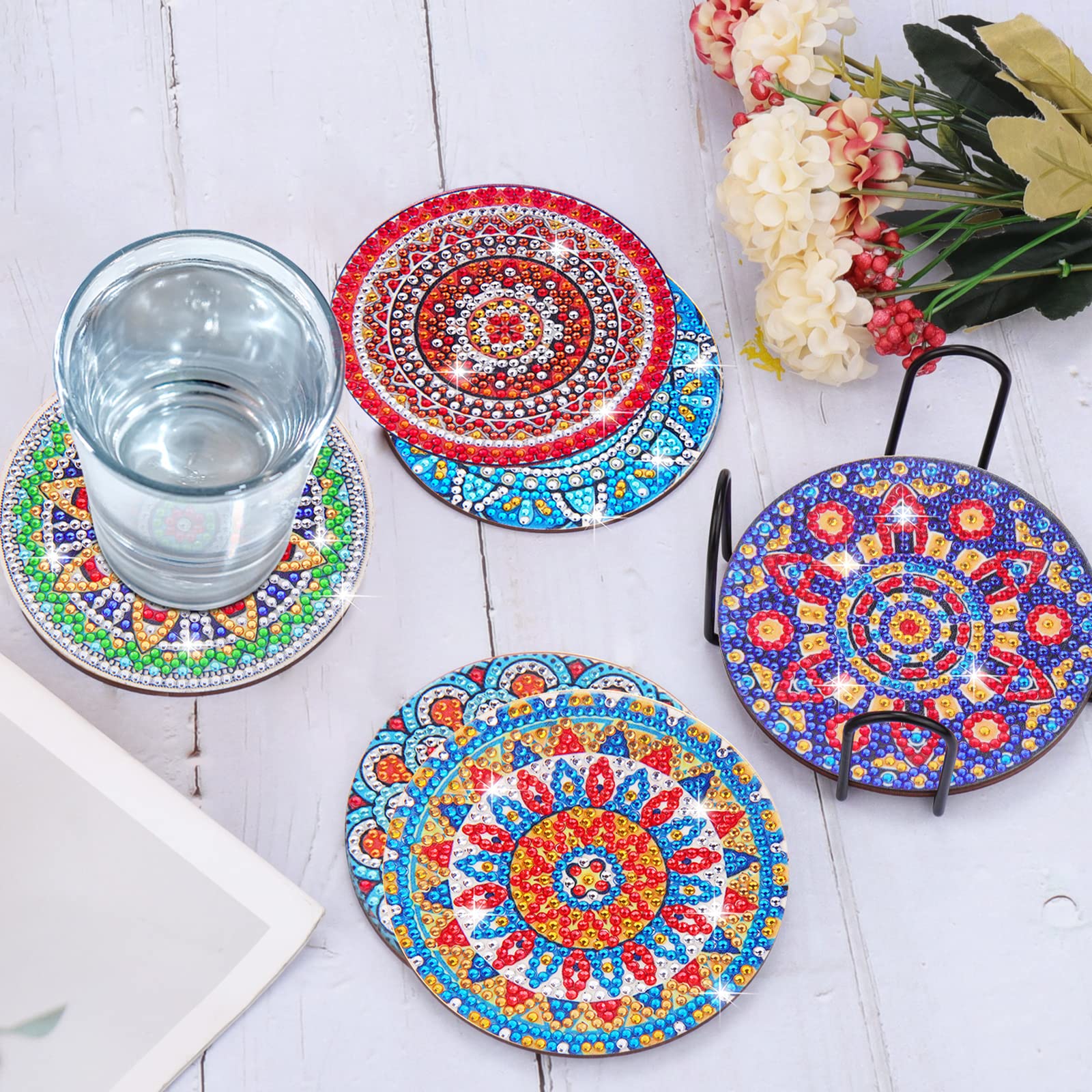 8 Pcs Coasters with Holder, Mandala DIY Diamond Art Crafts for Adults, Small Diamond Painting Kits Accessories