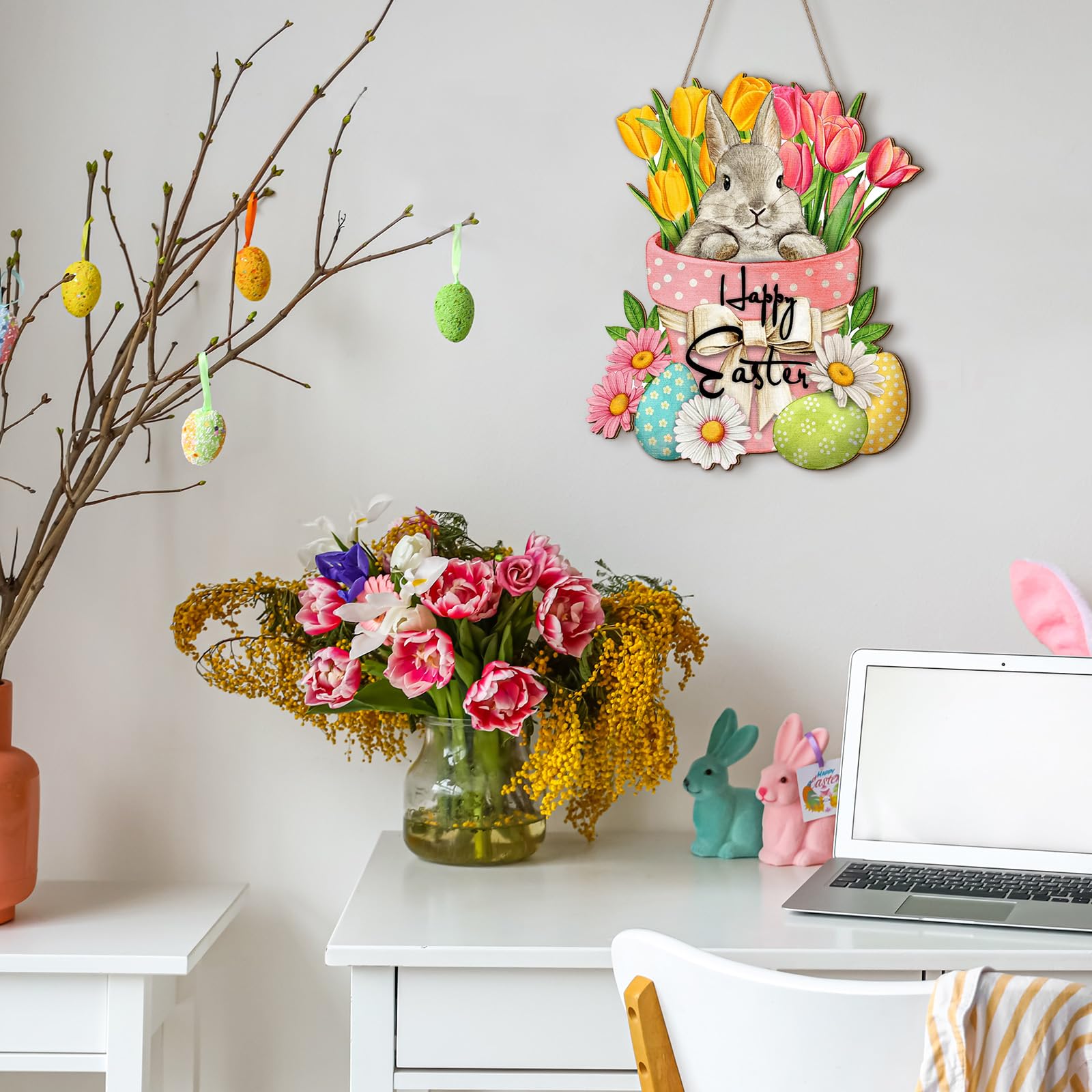 Happy Easter Hanging Sign for Front Door Wooden Easter Decoration for Home Indoor Outdoor Wall(Cute Rabbit)