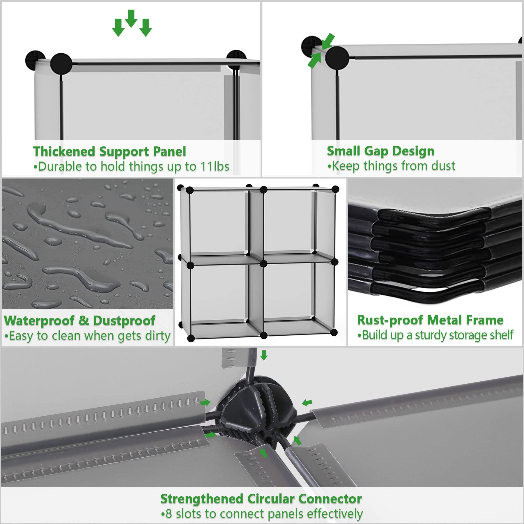 - HIGH QUALITY MATERIAL: This cube shelf is made up of high quality PP panels, sturdy metal frame and ABS plastic connectors. Stable structure ensures that each cube can withstand a maximum weight of 11 lbs