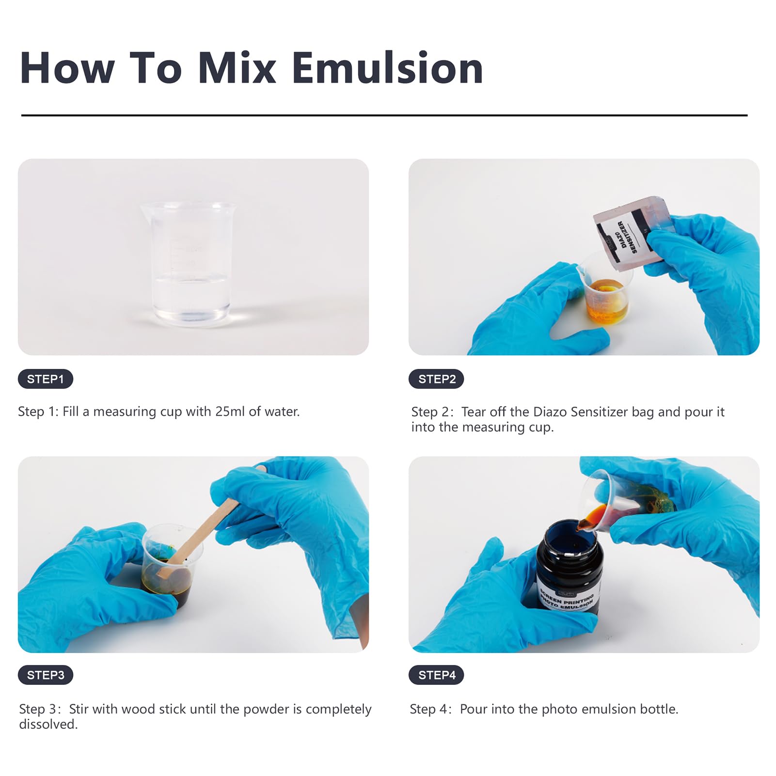 • Easy to Follow: Detailed instructions showing step-by-step on how to use screen printing photo emulsion effectively. Even if you are a beginner in screen printing, you can easily understand and follow the instructions to achieve desired effects. Note: The photo emulsion mixed with diazo sensitizer needs to be used up as soon as possible