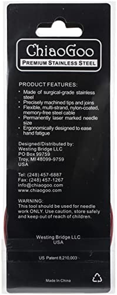- ChiaoGoo Red Lace circulars are made of high grade stainless steel and come with a bright red, highly flexible, multi-strand, nylon-coated, steel cable allowing your yarn to easily slide end-to-end