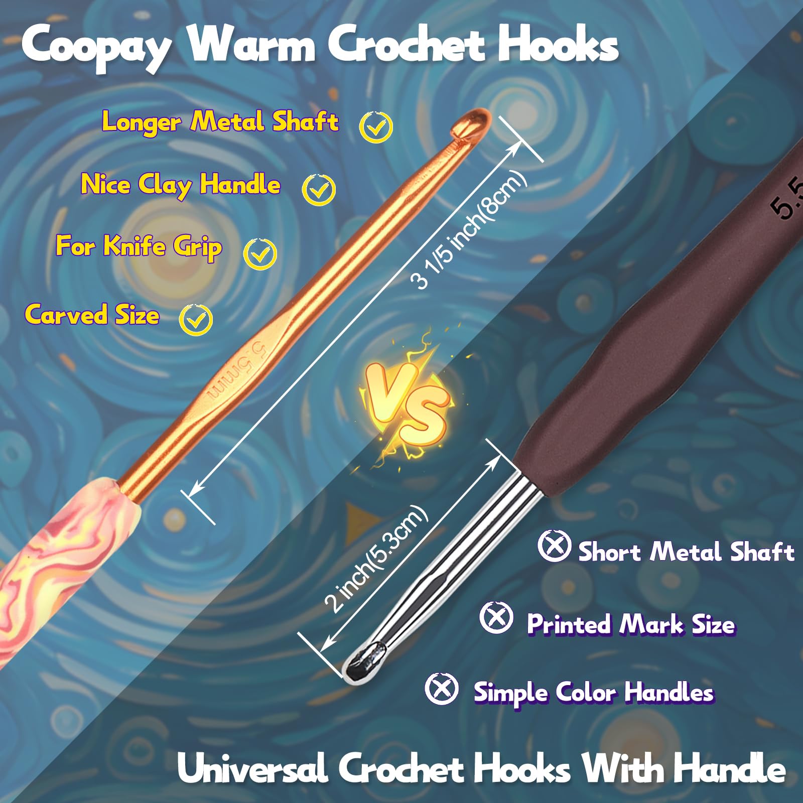 - Perfect Gifts: Coopay warm crochet hook set provides nine different sizes of crochet needles for crocheting yarn 2.0mm-6.0mm (B-J), which can meet different needs to weave various DIY handicrafts, such as sweaters, hats, scarves, dolls, woven flowers. Warm crochet hook set for arthritis is an ideal gift for mothers, wives, kids, girlfriends, crochet beginner, avid knitter, knitting enthusiasts on birthdays, Mother's Day, Valentine's Day, Christmas Day, Thanksgiving and New Year.