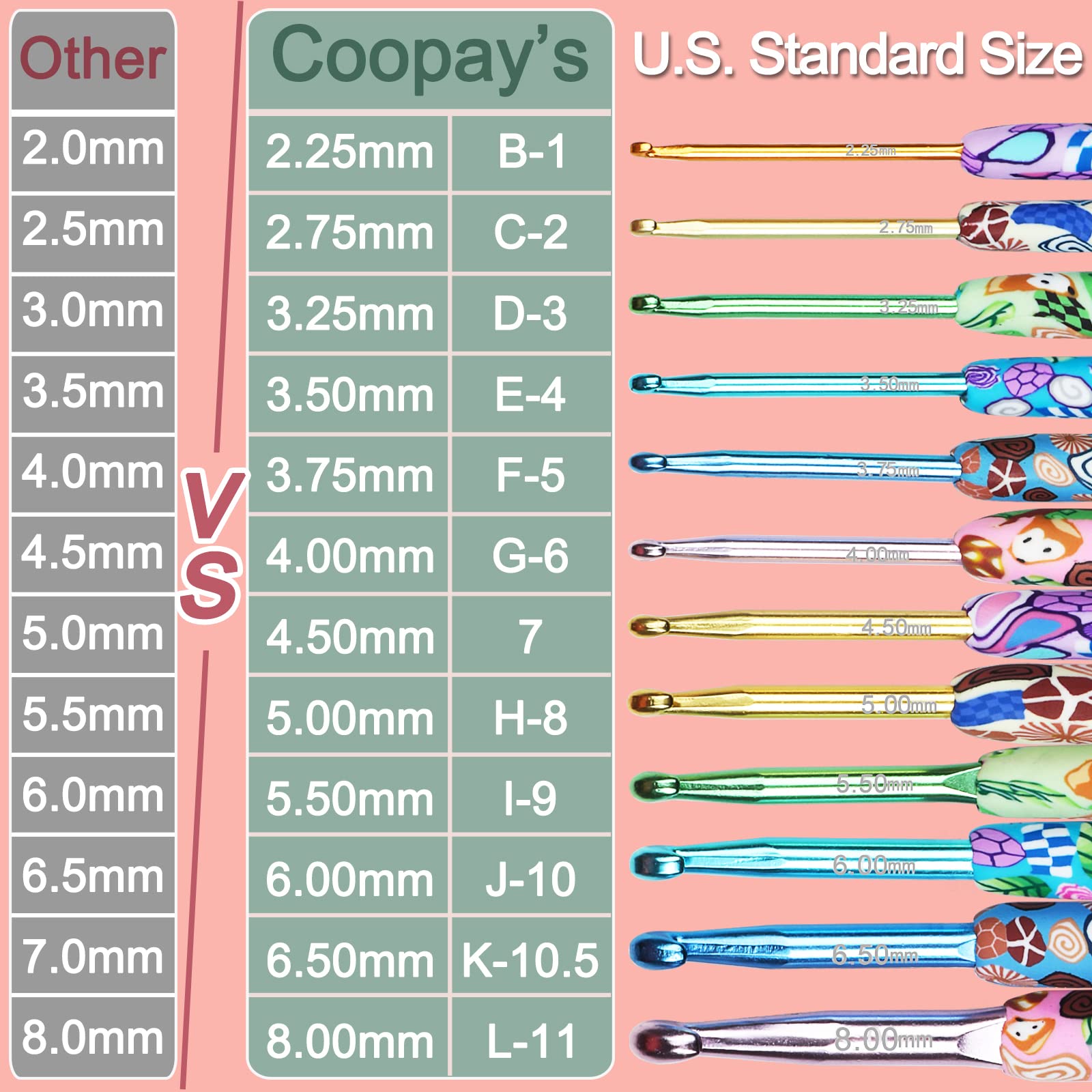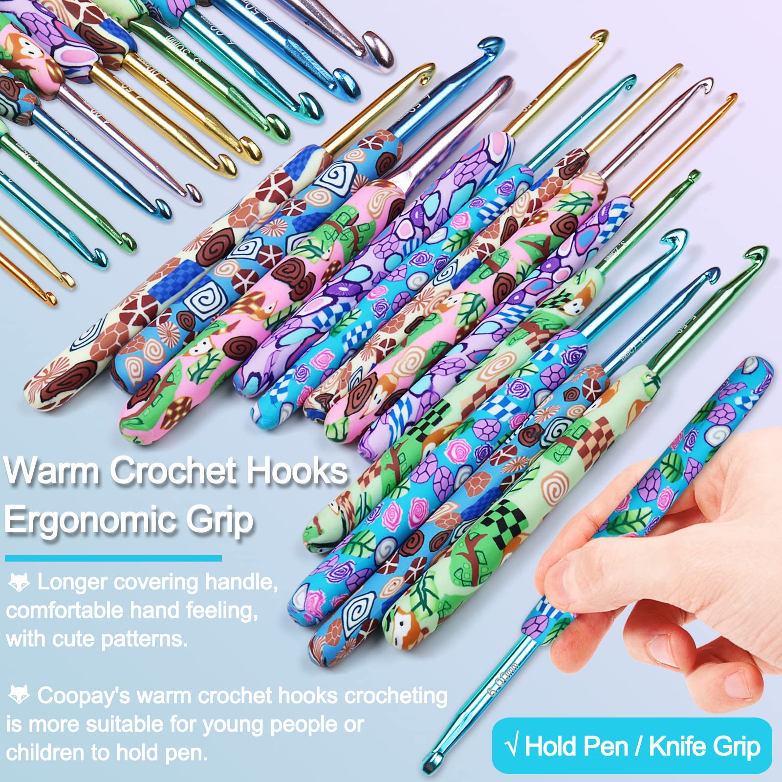 - U.S. Standard Size Crochet Hooks: Compared with other crochet hook set, Coopay 12pcs warm crochet hooks crocheting has been improved in size, which is more in line with the American standard size(B-1 to L-11/2.25mm-8.00mm). Using advanced technology to mark the size on the metal hook, it is very clear even after long-term use, and will not be worn. The handle pattern of the crochet set adopts a more dynamic and natural forest animal pattern, which helps relieve eye fatigue.