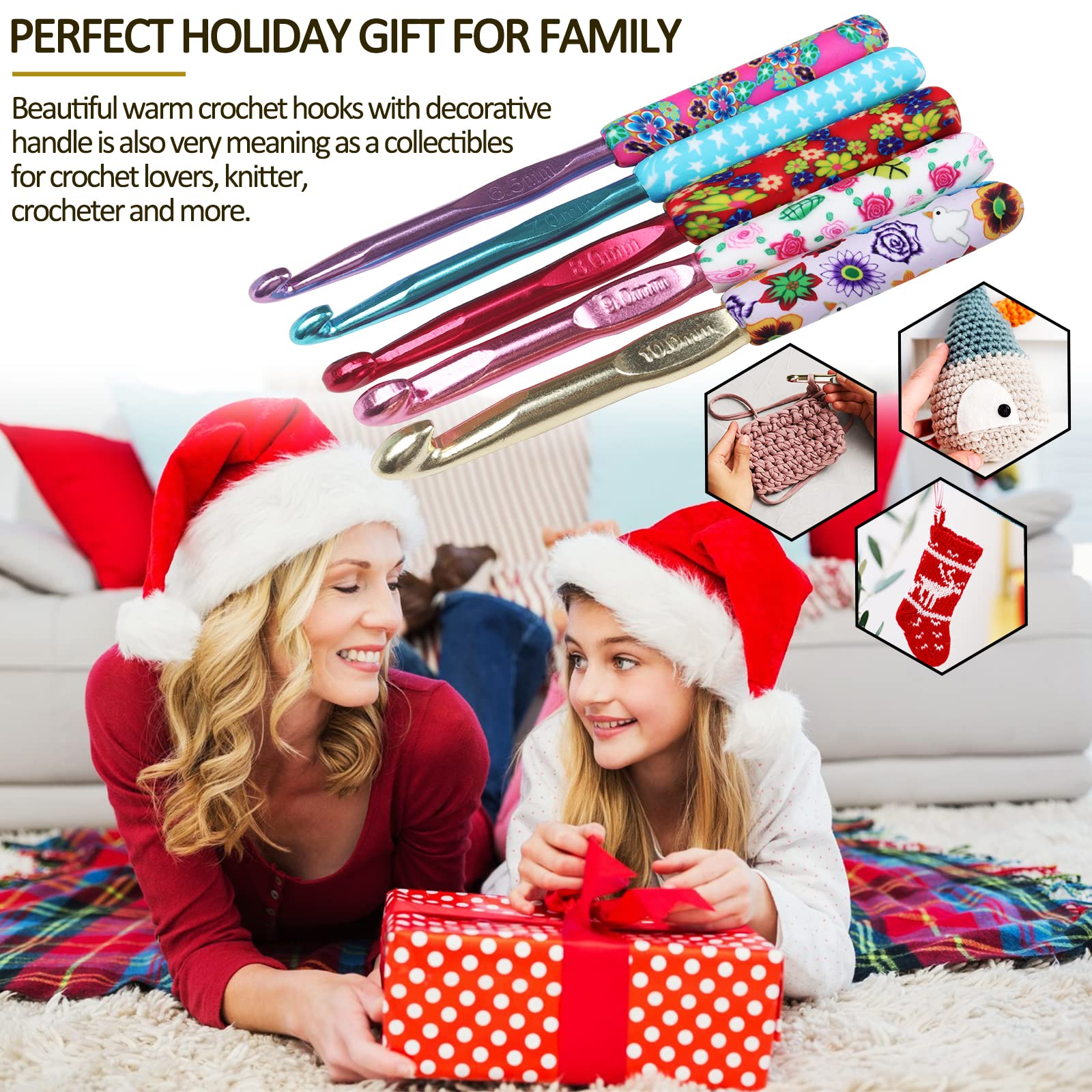- Pretty & Smooth Aluminum Hook, Easily Identify Size: The crochet grip pattern adopts beautiful flower series patterns. Our crochet hook set has a smooth hook, which doesn't catch on the yarn or split the yarn. Making the crocheting process more efficient and comfortable. Multicolor crochet hooks needles, different colors match different knitting needles size. Every hook is marked with numbers and letters, so you’ll never be confused