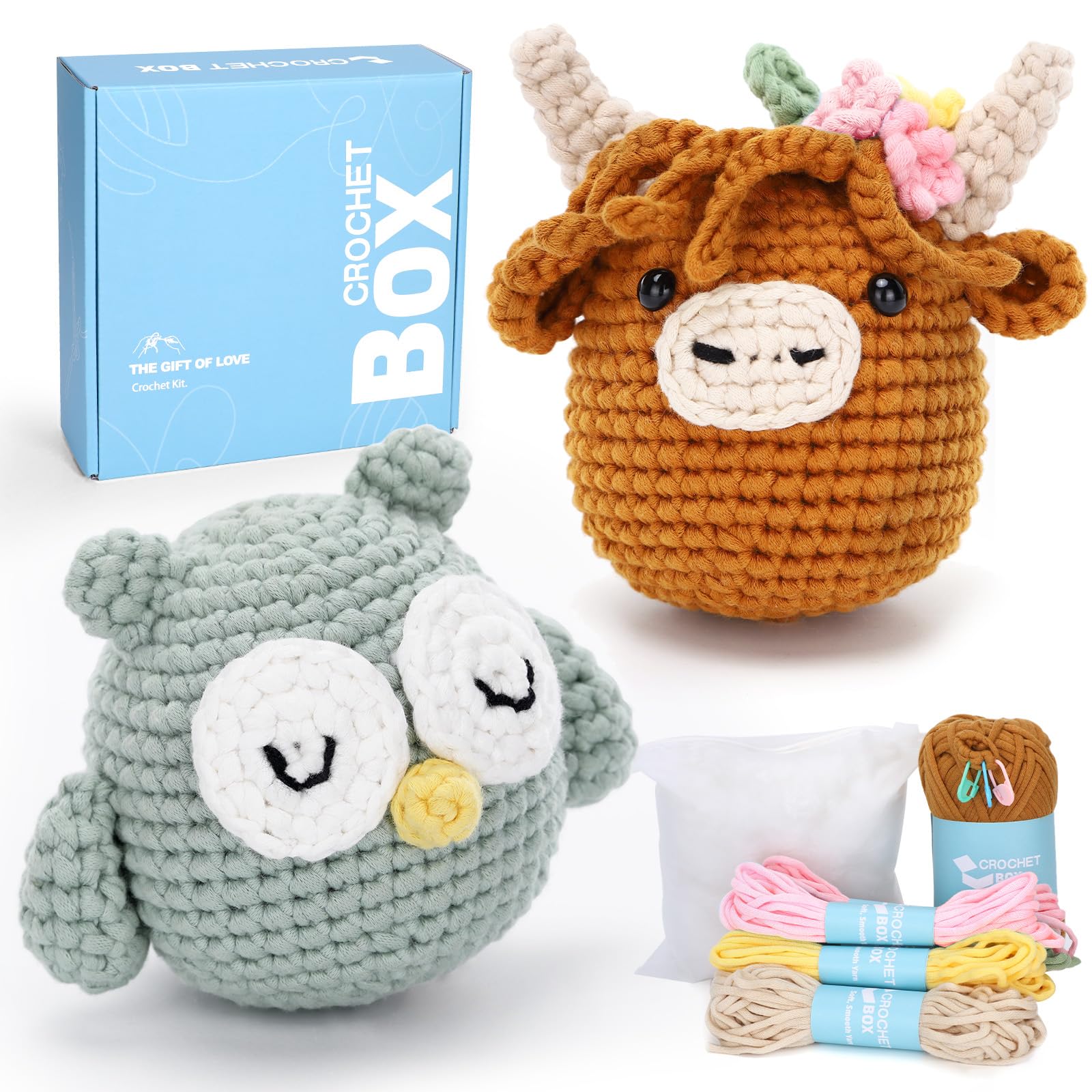 Crochet Box Crochet Kit for Beginner, Highland Cow and Owl Learn How to Crochet Stuffed Animals Gift for Adults and Kids(12+), Knitting Set with Yarn Hook Stitch-by-Stitch Video Tutorial