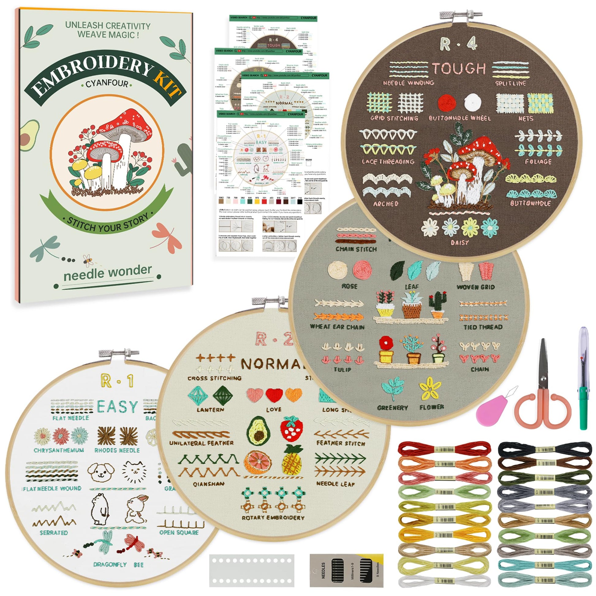 - [ INCLUDES EVERYTHINGS YOU NEED ] Exquisite gift box contains 4 embroidered fabrics with patterns, 20 color threads, 4 instructions, 9 needles, 1 pair of scissors, 1 embroidery thread board, 1 embroidery hoop, 1 needle threader, 1 seam ripper,meeting all your needs in the process of advancing your embroidery skills!