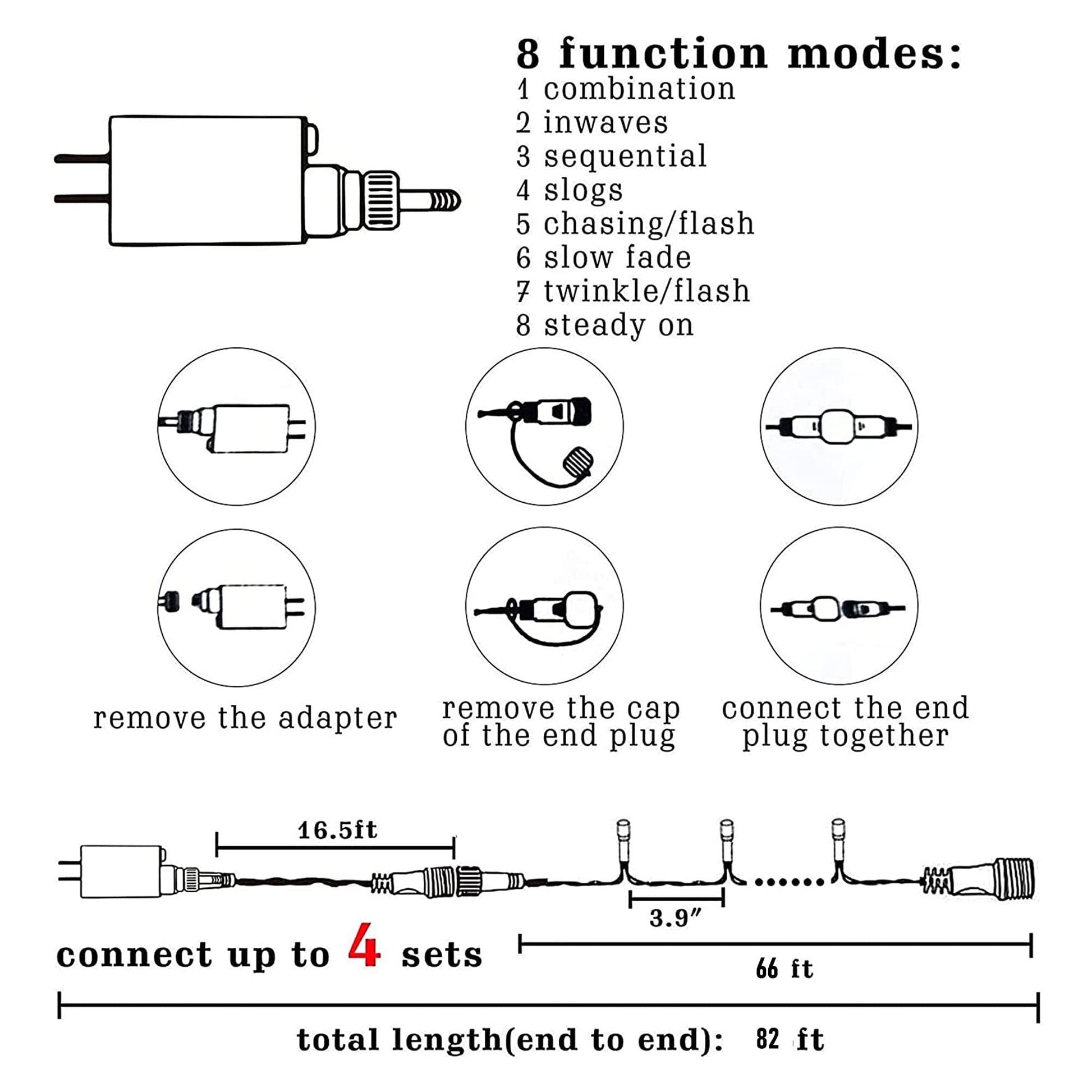 - 8 Lighting Modes: 8 Modes for you to choose: combination, in waves, sequential, slogs, chasing/flash, slow fade, twinkle/flash, and steady on. You can select your favorite flash mode by pressing the mode button on the plug.