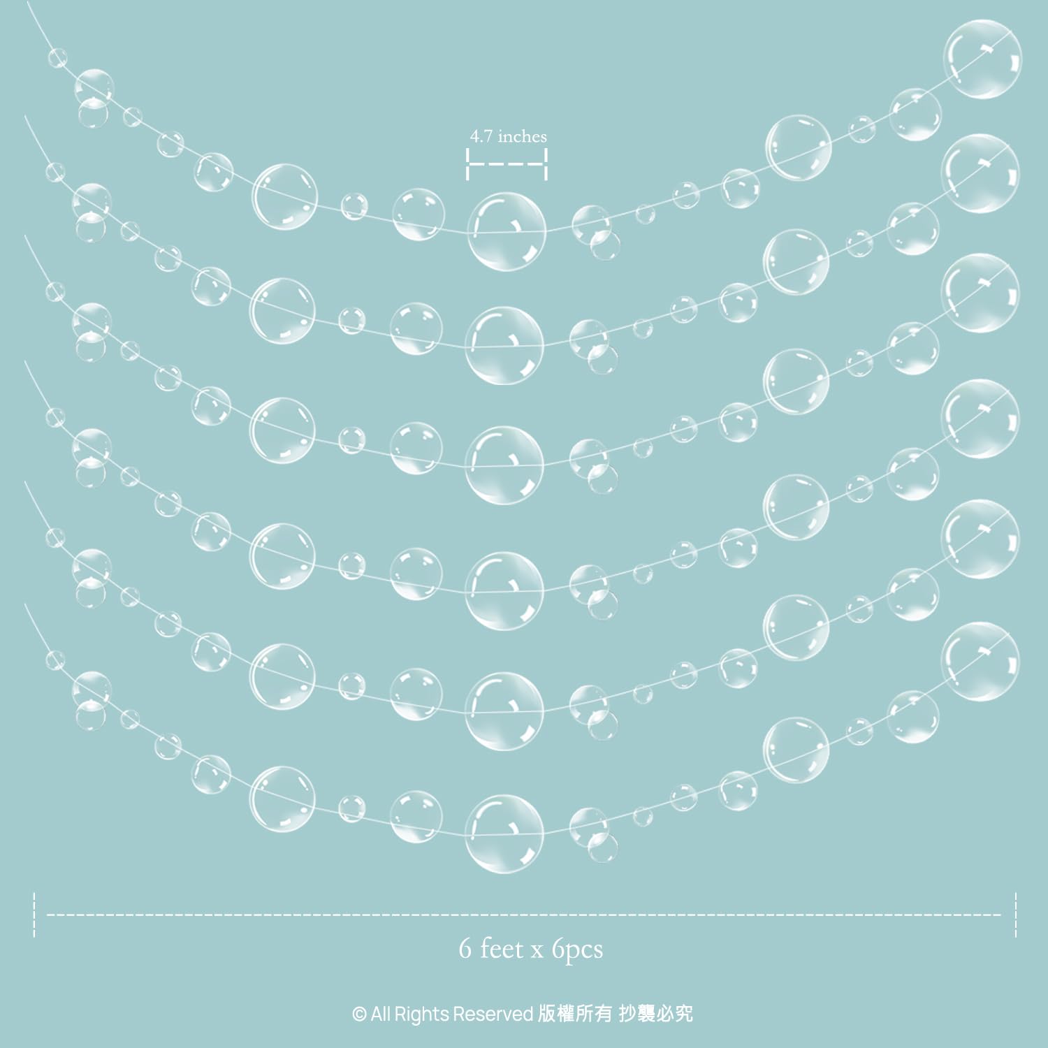 - Package Includes: 6 strings of white transparent bubble garlands, each 6 feet long, totaling 36 feet. Made of durable semi-transparent plastic sheets with a realistic 3D bubble decorations look. The largest bubble measures 4.7 inches in diameter. Comes pre-assembled for quick setup.