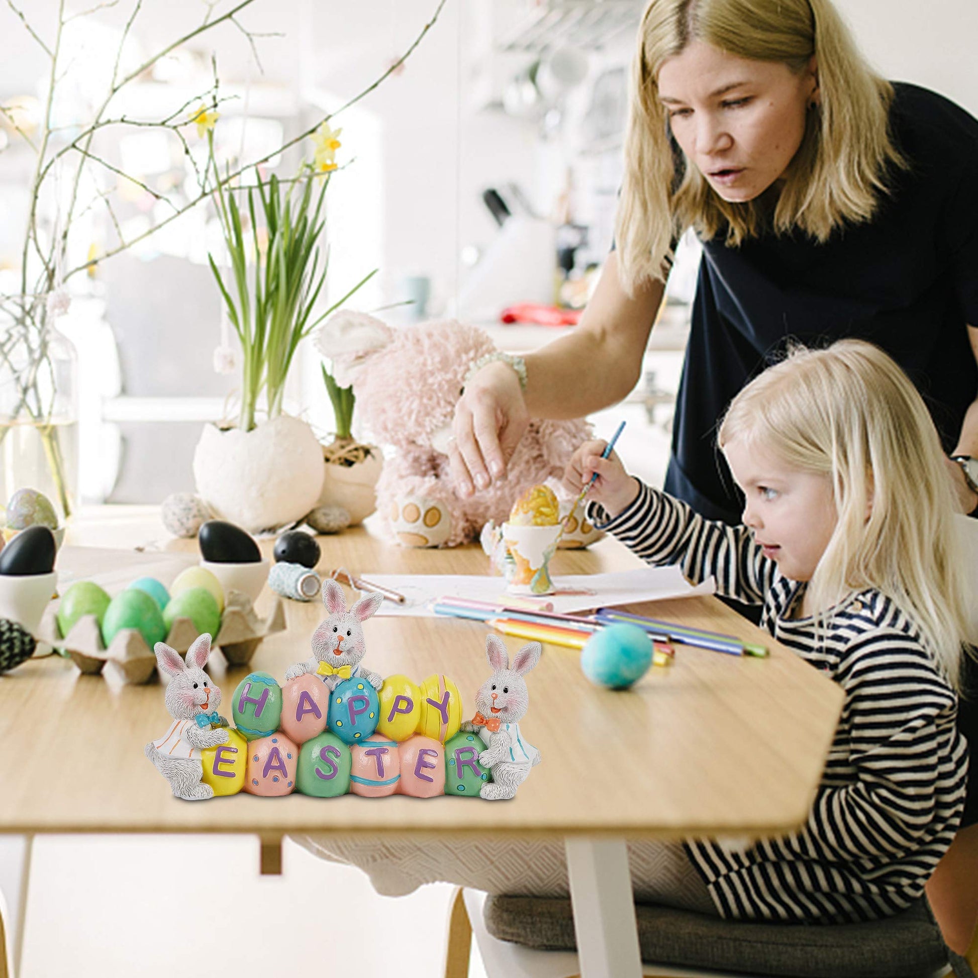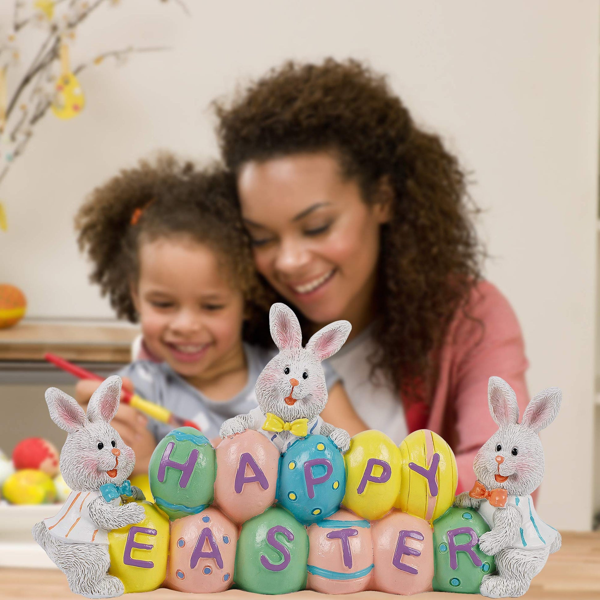 - Happy Easter - The Resin Tabletop Decor is well crafted with 3 bunnies and 11 colorful Easter eggs engraved "HAPPY EASTER", as well as a blue rock on the right. The size is 8.5 x 1.5 x 4.5 inches (LxWxH). It is an ideal Easter home decoration.