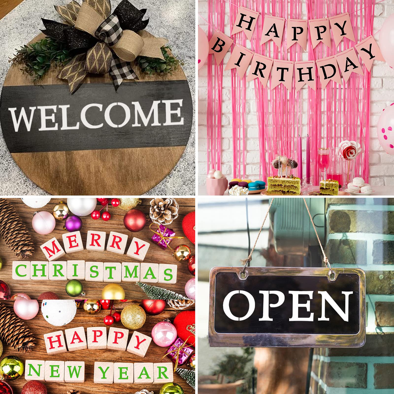 - 【Wide Application and Easy to Store】: The alphabet stencils can be applied for wedding, banners, signage making, poster making, festivals, card DIY, home or party crafts, bistro, office decor, porch sign, like journal/fabric/cake decoration, airbrushing, making photo album cards, and more DIY art projects. These stencils can be stored in carton box or even in an organizer. Save your time, space, and make an upgrade!
