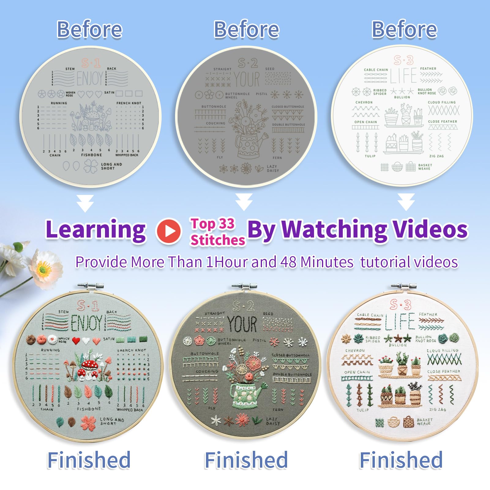 Embroidery Kit for Adult Beginners, 3-Pack 33-Stitch Practice Samplers, Pre-Stamped Patterns, 7.8 Inch Hoop, Threads and Needles, Step-by-Step Guide with Video