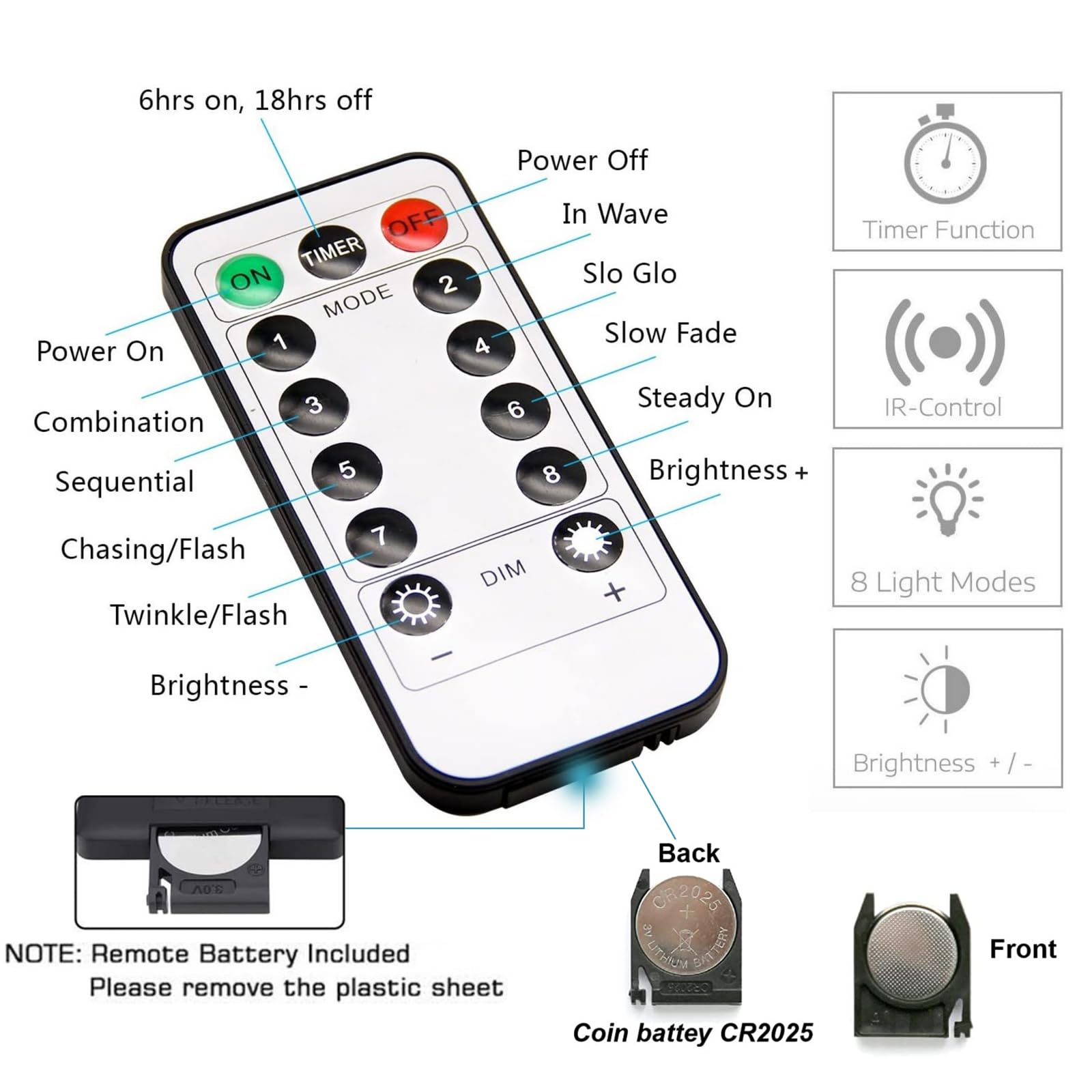 - Timer Remote: Control the lights with the wireless remote and choose from 8 different flash modes, including combination, in waves, sequential, slogs, chasing/ flash, slow fade, twinkle/ flash, and steady on. Plus, activate the timer to automatically turn the lights on for 6 hours and off for 18 hours every 24 hours.