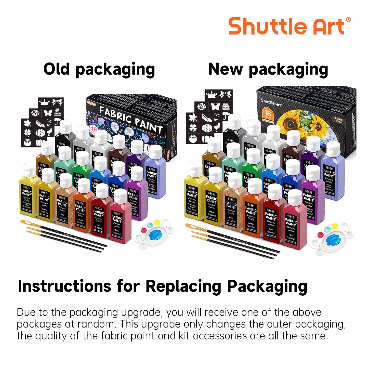 - 18 VIBRANT COLORS WITH STENCILS : Shuttle Art fabric paint set contains 18 colors soft fabric paint in bottles (60 ml/2 oz), 3 brushes, 1 palette and 18 patterns sticker stencils, perfect for various textile paintings and art crafts