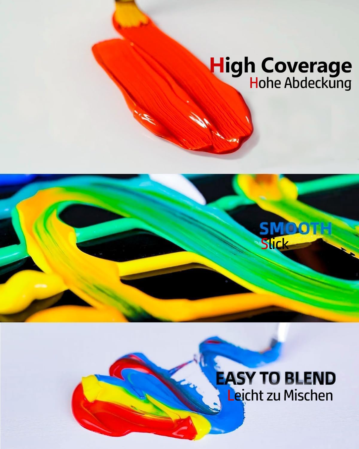 - 🎨PREMUIM QUALITY PAINT- Premium outdoor/indoor use craft acrylic paint glide on smoothly, dry quickly and stay as beautiful as the day they were painted. The creamy consistency and high pigments offer great covering power for large areas and fine details. Those highly pigmented colors are great to produce true, consistent shades on painting art, ideal for professional artists, young aspiring artists, painting lovers . ASTM D-4236 and EN71-3 (CE) certified, non-toxic and safe.