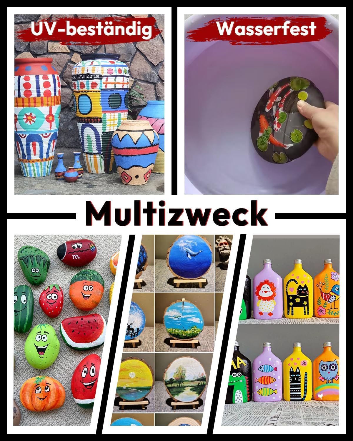 - 🎨EASY MIX & INFINITE RANGE OF COLOR - The clarity and brilliance allow for superb color mixing to provide a bigger color palette of shades and tones. Let your imagination run wild and create an infinite number of hues in a few seconds with our easy-to-mix 24 assorted colors acrylic paints. Paints set is suitable for multi-surface, including glass (bottles, vase, etc.), nail, wood, canvas, rocks, stone, ceramic, clay, shoe, plastic, paper, fabric, Styrofoam, blackboard, paper, plaster and more.