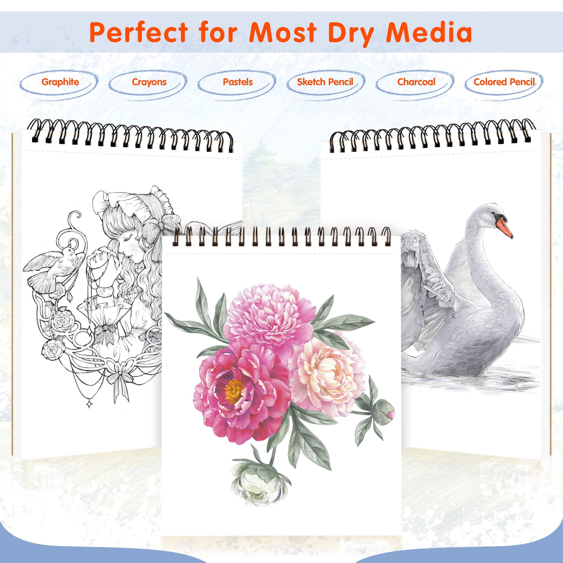- 【Suitable for Variety of Media】Our drawing book features high-quality drawing paper that has a fine tooth surface. So it easily holds up to all dry media include pencil, pen, pastels, charcoal, graphite, sketching sticks, gel pen, maker and so on. It‘s capable of resisting repeated erasing without destroying the texture or leaving noticeable marks.