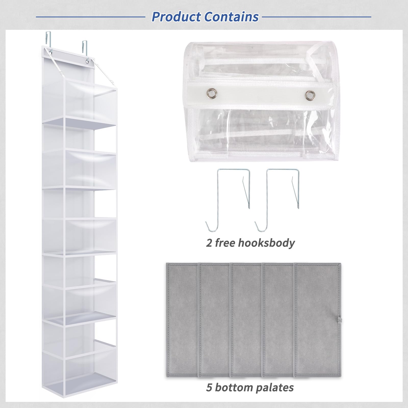 - [Package Contents]: 1 fully transparent over the door organizer, 5 grey pp bottom plates, 2 metal hooks. If there is any problem during use, please contact us immediately to solve it.