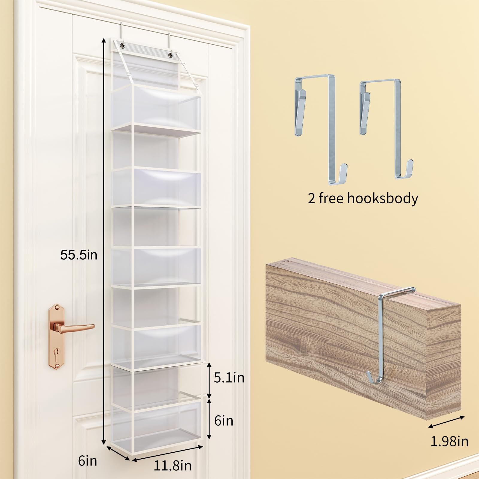 - [Easy to Install]: 2 metal hooks and loops. Our 5 shelf fully clear over the door storage organizer is easy to install in just 3 simple steps. Metal hooks fit well on most doors (standard door thickness is 1.98"). The hooks fit the door nicely without scratching the door trim or paint. Please make sure the door thickness is 1.98 inches or less before purchase.
